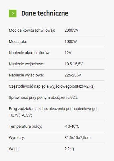 Електронний перетворювач Sinus 2000 1000/2000 12V 12В з вольт Полської використовується для електричних пристроїв Asilanie, що вимагає 230 В чергування напруги з батарей та автомобільних установ з постійною напругою 12В. енергія. Конвертер, що продається на цьому аукціоні, додатково має USB -розетку для подачі пристроїв, що потребують напруги 5v . Безперервна потужність 1000W Тимчасова потужність 2000va.