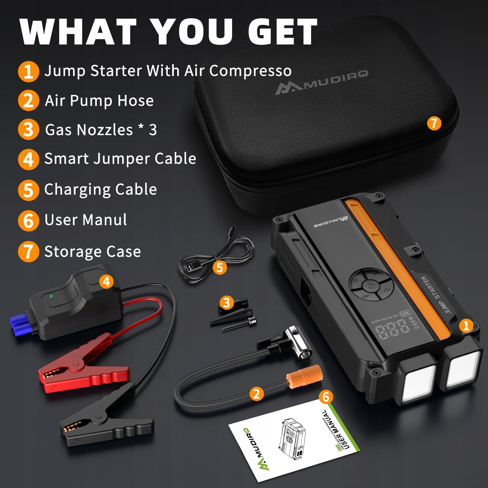 - ✿1 x M-JA1 Джамп Стартер з повітряним компресором & ✿1 x Розумні з’єднувальні кабелі