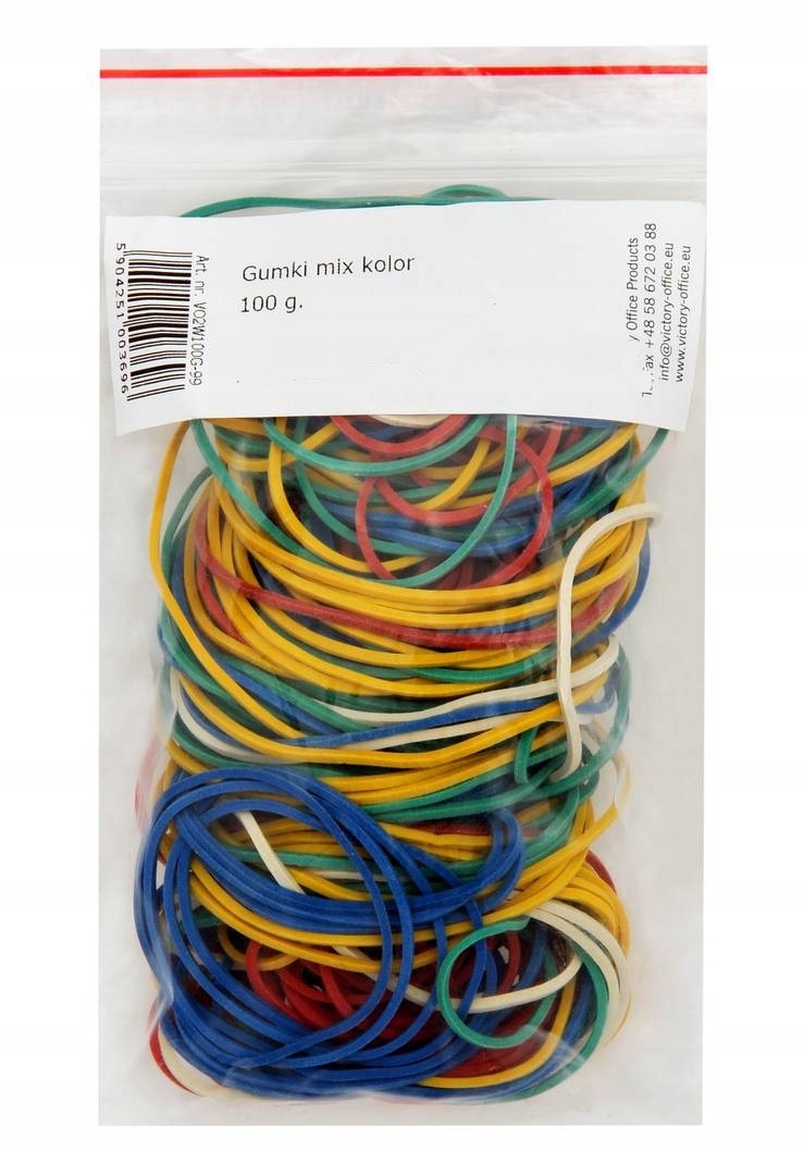 Міцні резинки різних кольорів. Гнучкий і міцний матеріал, стійкий до розтріскування. Вони містять 60% каучуку. Упакований в пакет з прозорої фольги. Вага нетто в упаковці: 100г.