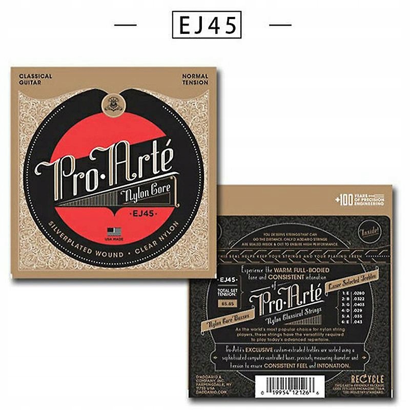 Струни D'Addario EJ45 - це комбінація 3 прозорих нейлонових струн для високих частот і 3 басових струн, які виготовлені з посрібленої оболонки навколо нейлонового сердечника. мультифіламент (з багатьох волокон), завдяки якому ви можете отримати теплий, збалансований, але також виразний звук.