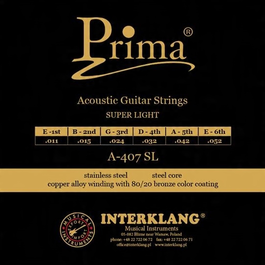 Струни Prima A-407XL 80/20 Бронза, також відомі як латунь, це матеріал, який використовується для струн для акустичних гітар з 1930-х років. Ці струни часто вибирають для запису завдяки їх яскравому, але глибокому звучанню. Всі струни акустичної гітари Prima намотані на шестигранний сердечник з високовуглецевої нержавіючої сталі, що гарантує яскравий і міцний звук і ідеальне інтонування. Додатковою перевагою є запасна струнаE1. Набір: звичайна сталь .010, .014, бронза з раною .023, .030, .039, .047.