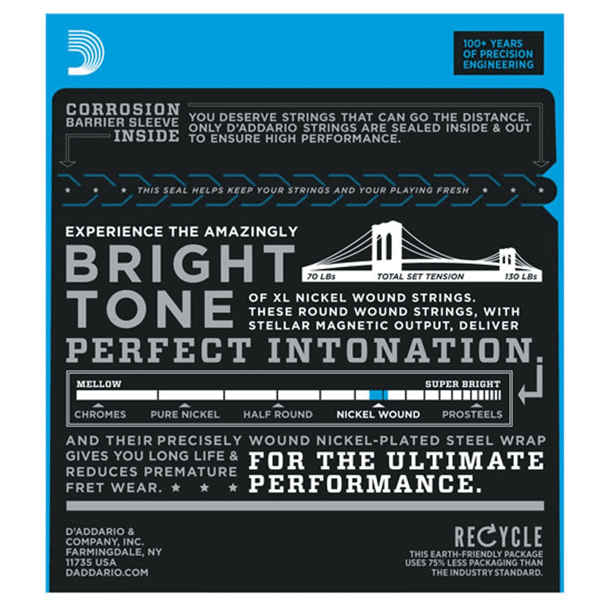 струни D'A Addario exl117 мають нікель -забиту упаковку з шестикутним (шестикутним) перехрестям. Цей набір забезпечує тривалий термін, характерний яскравий звук, призначений для всіх типів музики. дюйм):