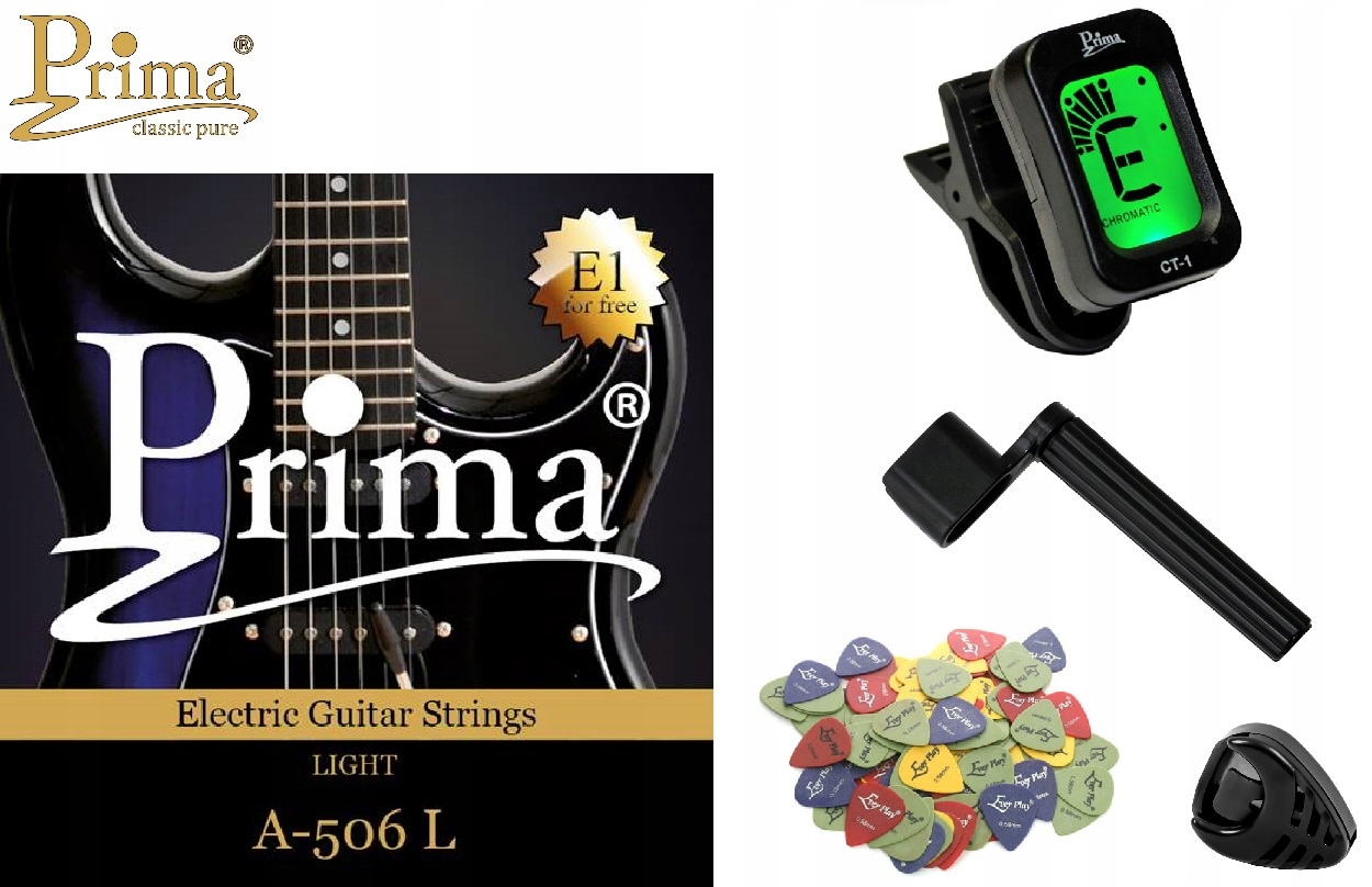 PRIMA A-506 Ці струни часто вибирають для запису через їх яскраве, але глибоке звучання. Всі струни для електрогітари Prima намотані на шестигранний сердечник з високовуглецевої нержавіючої сталі, що гарантує яскравий і міцний звук і ідеальне інтонування. Додатковою перевагою є запасна струна E1.