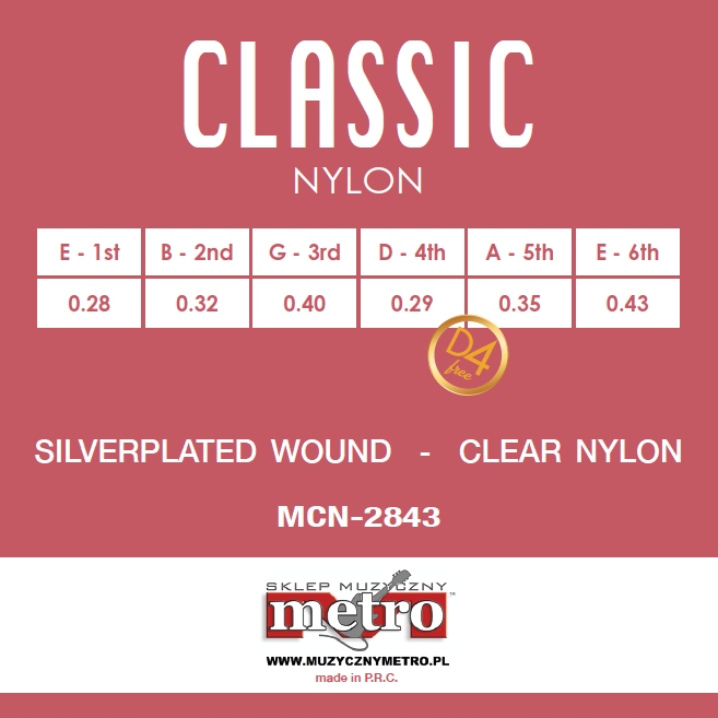 Вибір правильних струн для класичної гітари дуже важливий, оскільки чим кращі струни, тим краща якість звуку, і ви повинні пам’ятати, що кожна модель струн відрізняється. Звісно, не обов’язково купувати найдорожчі струни, щоб насолоджуватися прекрасним звуком. Прикладом недорогих струн, які можуть вразити, є струни MCN-2843 Normal Tension, які звучать дуже чисто і природно і не викликають проблем з натисканням, тому вони також є хорошим вибором для початківців гітаристів. Додатковою перевагою цих струн є запасна струна D4.