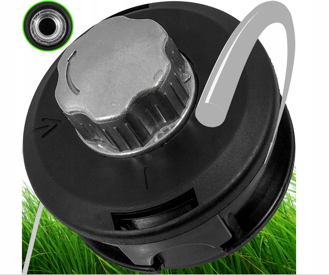 - Для заміни лінії в цій головці не потрібно розбирати головку. Для цього встановіть ручку таким чином, щоб виїмка на ній збігалася зі стрілками на корпусі. Потрібно відміряти 10 м волосіні, протягнути її через напрямні так, щоб з обох сторін залишилося приблизно 5 м волосіні. Потім скористайтеся верхньою ручкою, щоб змотати волосінь вправо, натисніть кнопку і поверніть її вліво, підходить для більшості кос і бензинових тримерів >Технічні дані:
