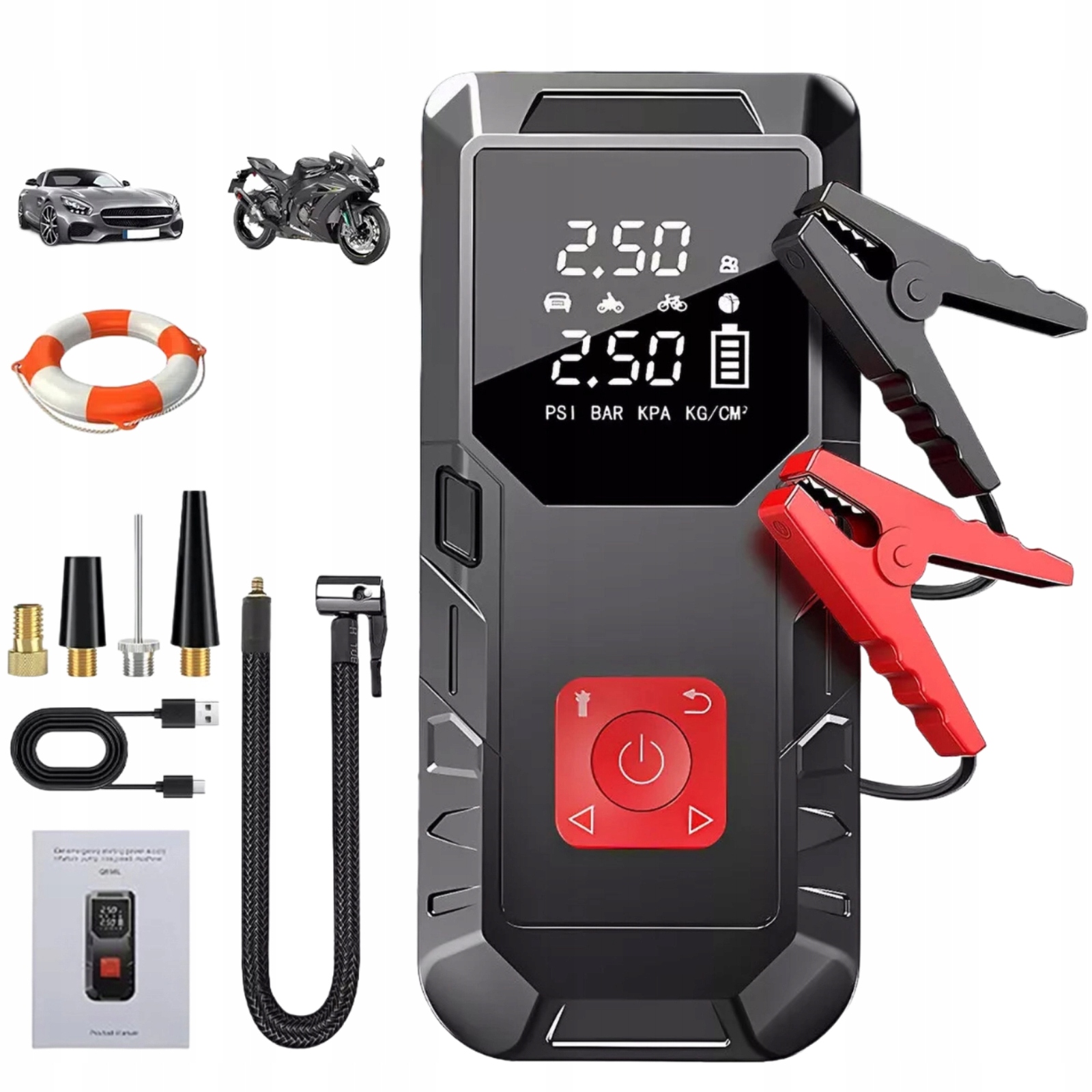 Інтелектуальний компресор цифрової шини: Портативний баванка з функцією запуску акумулятора автомобіля, а повітряний компресор має інтелектуальний екран та функцію вимірювання тиску в шинах (150 фунтів на дюйм). Powerbank для запуску автомобіля з компресором пропонує інтелектуальні, заздалегідь задані режими: 1: Нендистарна візерунка: 3 фунт / кв.дюйм - 150 фунт / кв. Дюйм 2: Кульна візерунка: 4 фунт / кв.дюйм - 16 фунт / кв. Дюйм 3: Верхність велосипеда: 30 фунтів на кв. Дюйм - 65 фунт / кв.дюйм 4: Мотоцикл: 1,7 бар - 2,9 бар 5: Автомобіль: 1,7 бар - 3,5 бар.