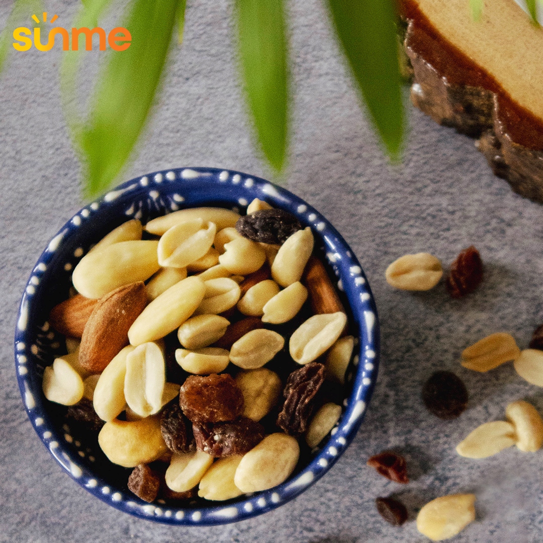 Наша суміш містить родзинки, смажений арахіс, кешью та мигдаль, які є смачною добавкою до вівсянки, каші , домашнє морозиво або інші корисні десерти.