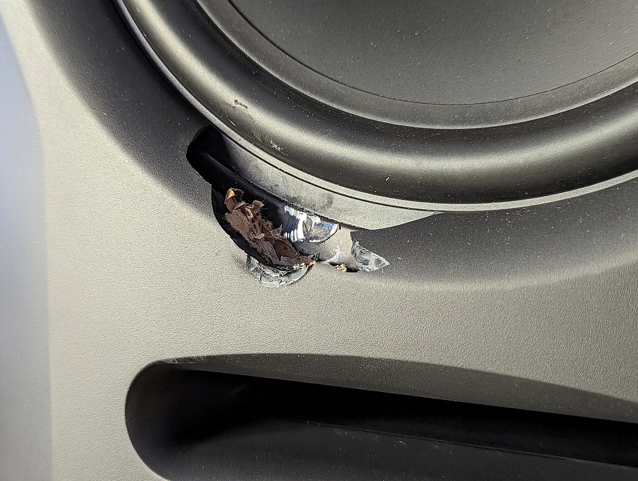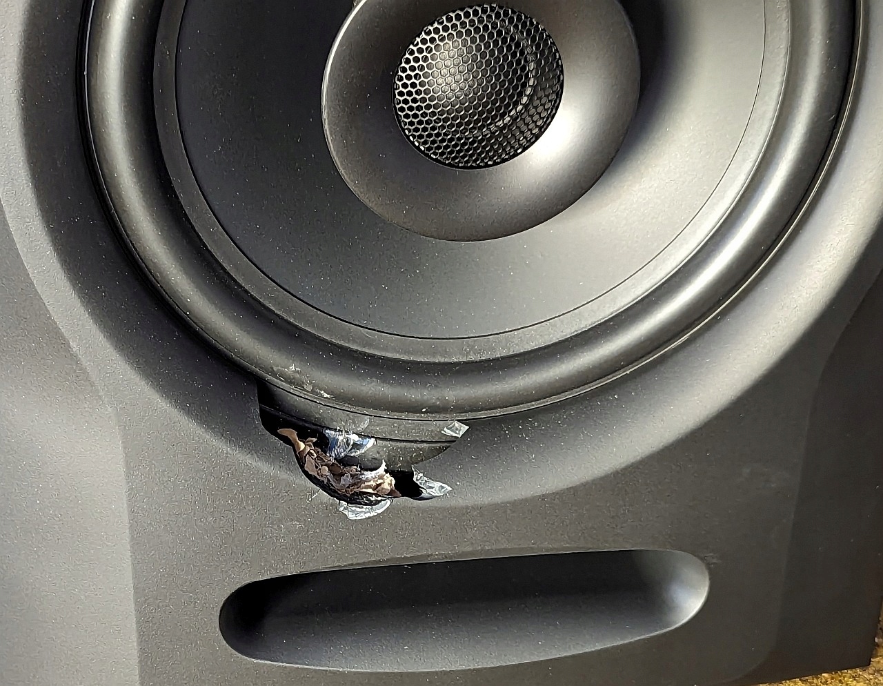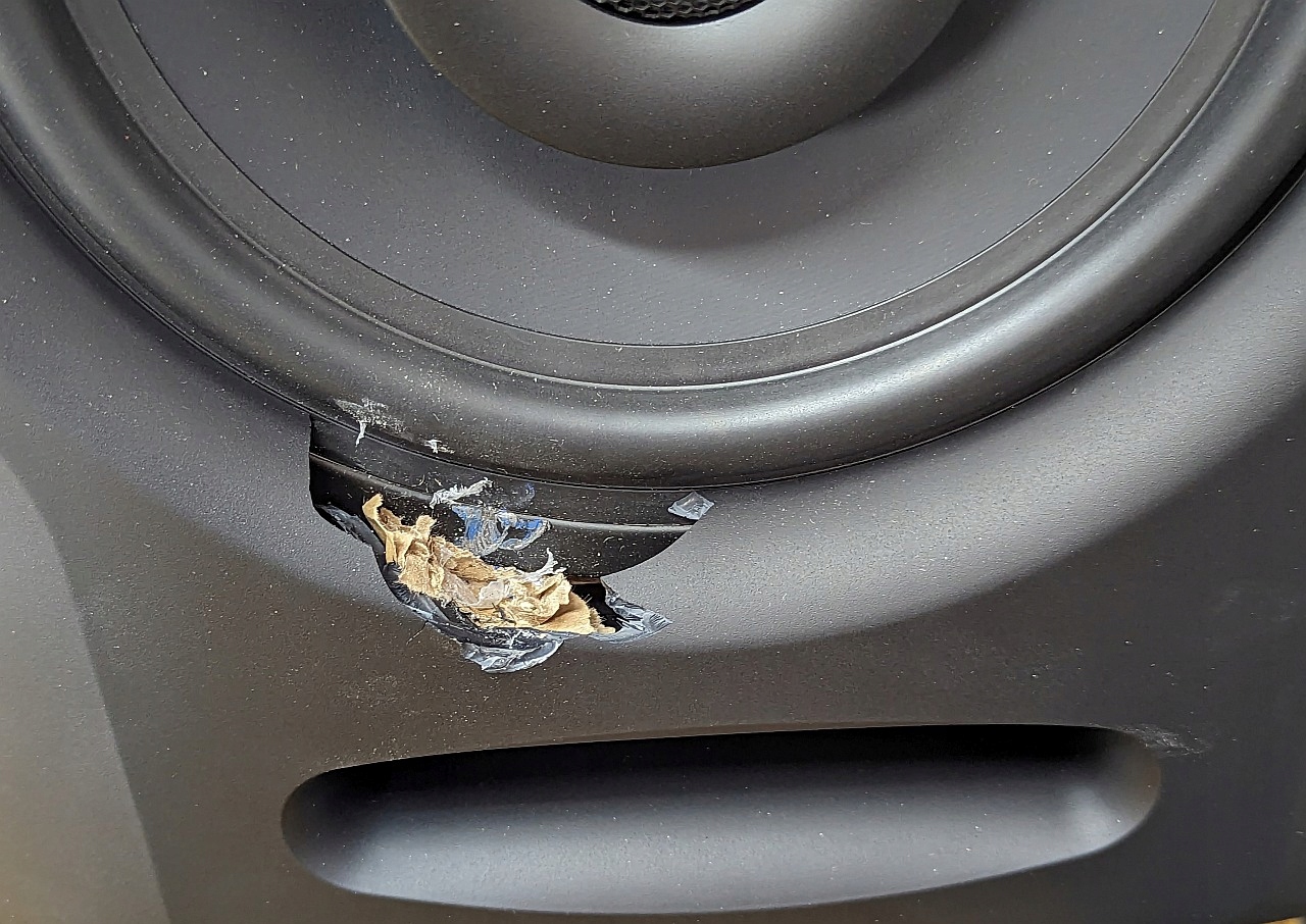 Пошкодження при транспортуванні, не впливають на якість відтворення звуку (резонансна камера не була пошкоджена), пошкодження обмежуються лише відламуванням частини декоративної решітки та підвішуванням НЧ у вигляді двох надрізів приблизно по 1,5 мм кожен, без впливає на якість звуку або термін служби самого гучномовця.
