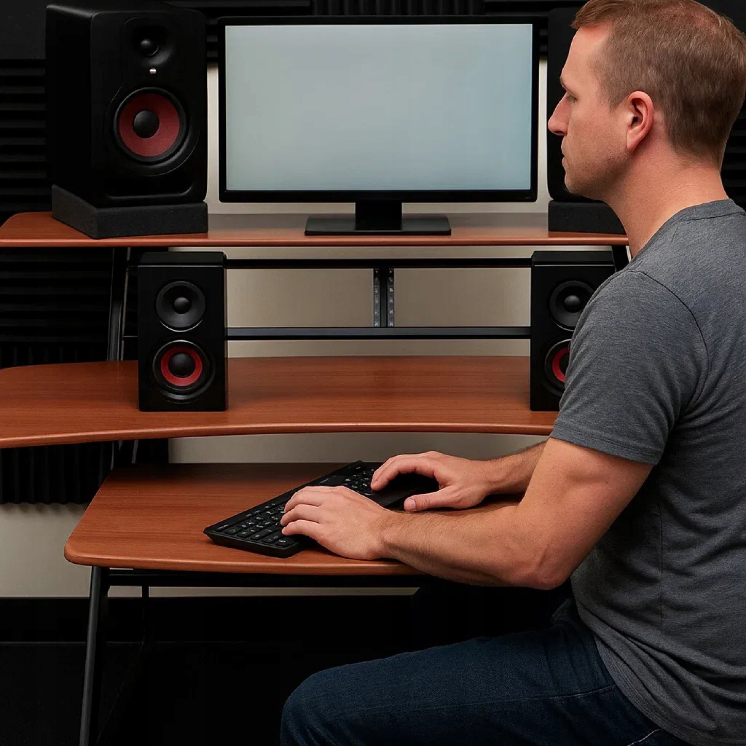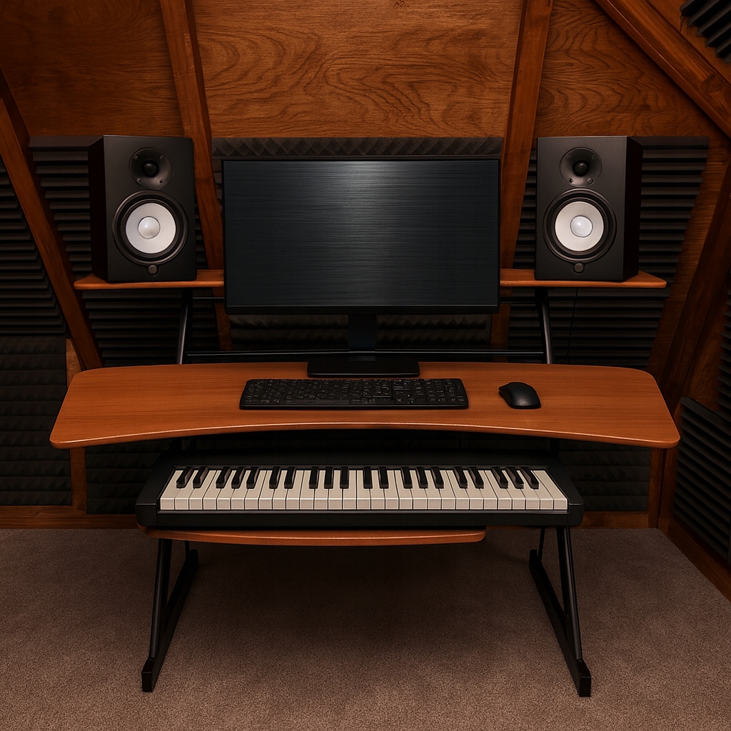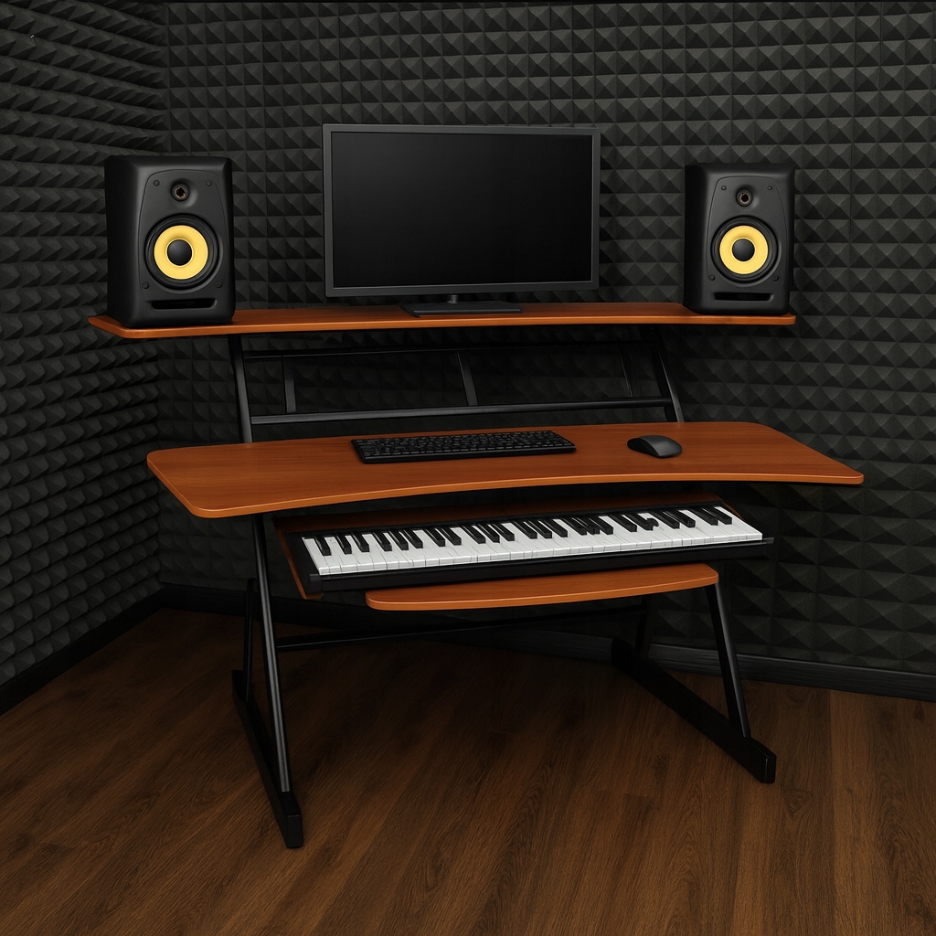 - Тип: робоча станція Studio Desktion з вершиною, полиця для аудіо обладнання та висувної полиці для клавіатури