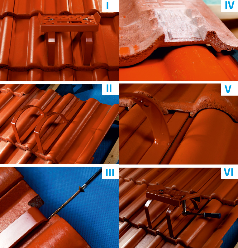 2. Починаємо збірку з розміщення кронштейнів на відстані 110-190 мм на двох різних плитках. Відшліфуйте замок плитки в місці установки. Також рекомендується зробити П-подібну виїмку, щоб кронштейни впиралися в обрешітку, а не в край черепиці.