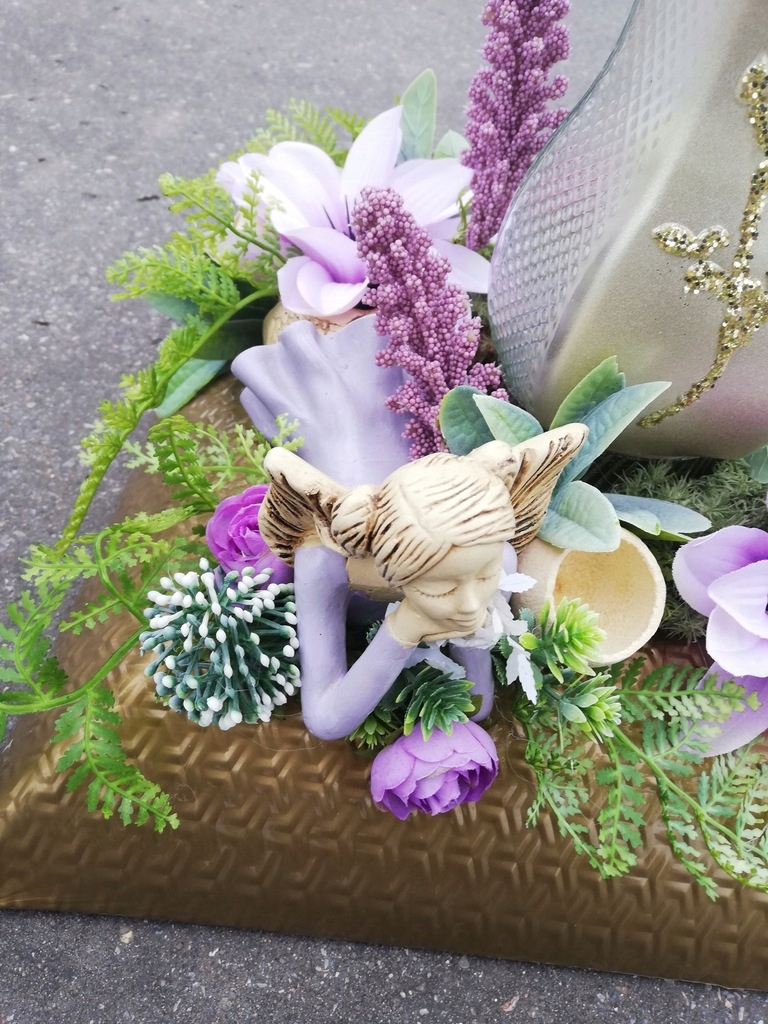 Могильна квіткова композиціябула ретельно створена, з дотриманням модних кольорів та дуже якісних матеріалів та штучних квітів, на заштукатуреній основі, з ручним ангелом та свічкою, які постійно приклеєні до композиції. p>
