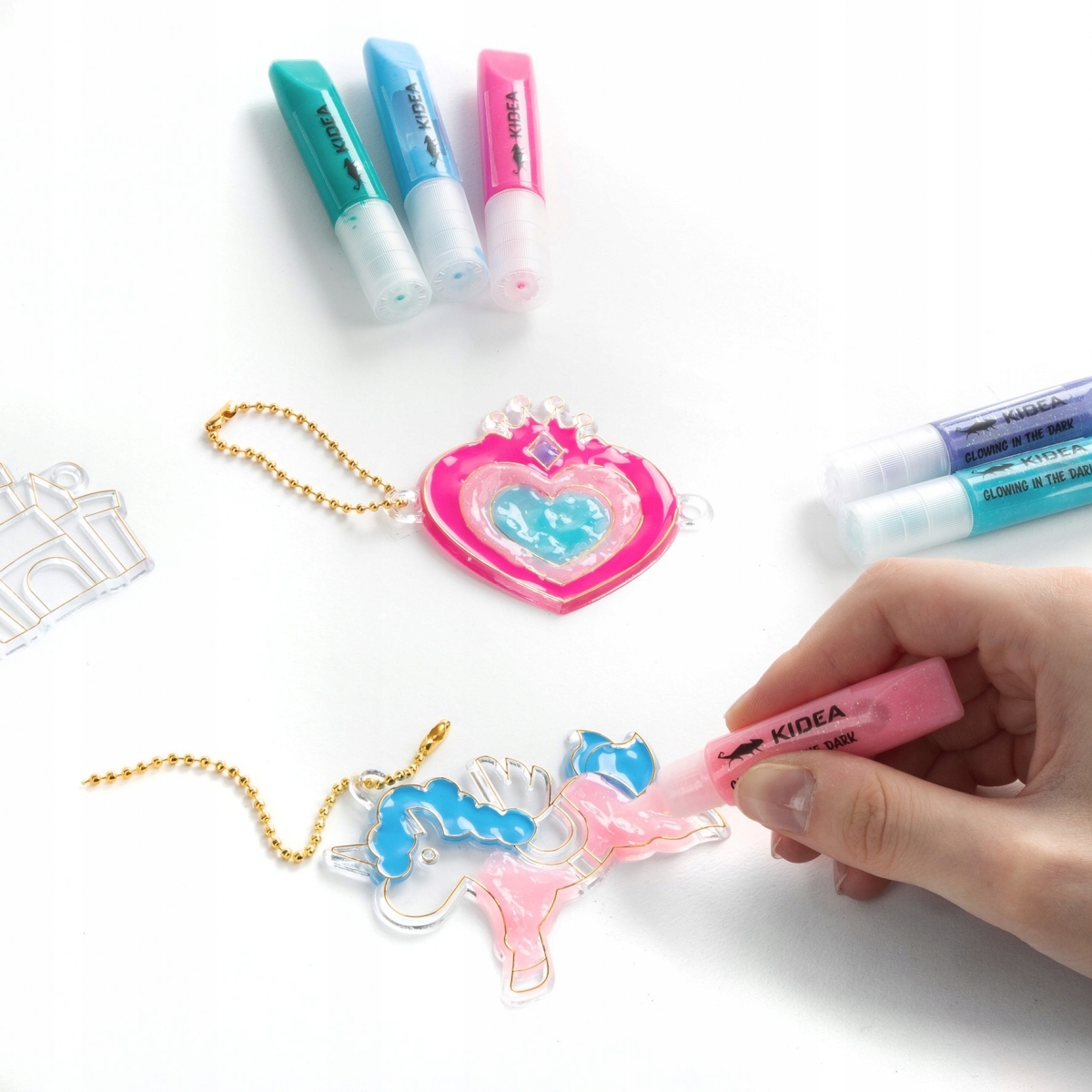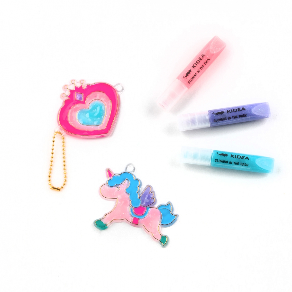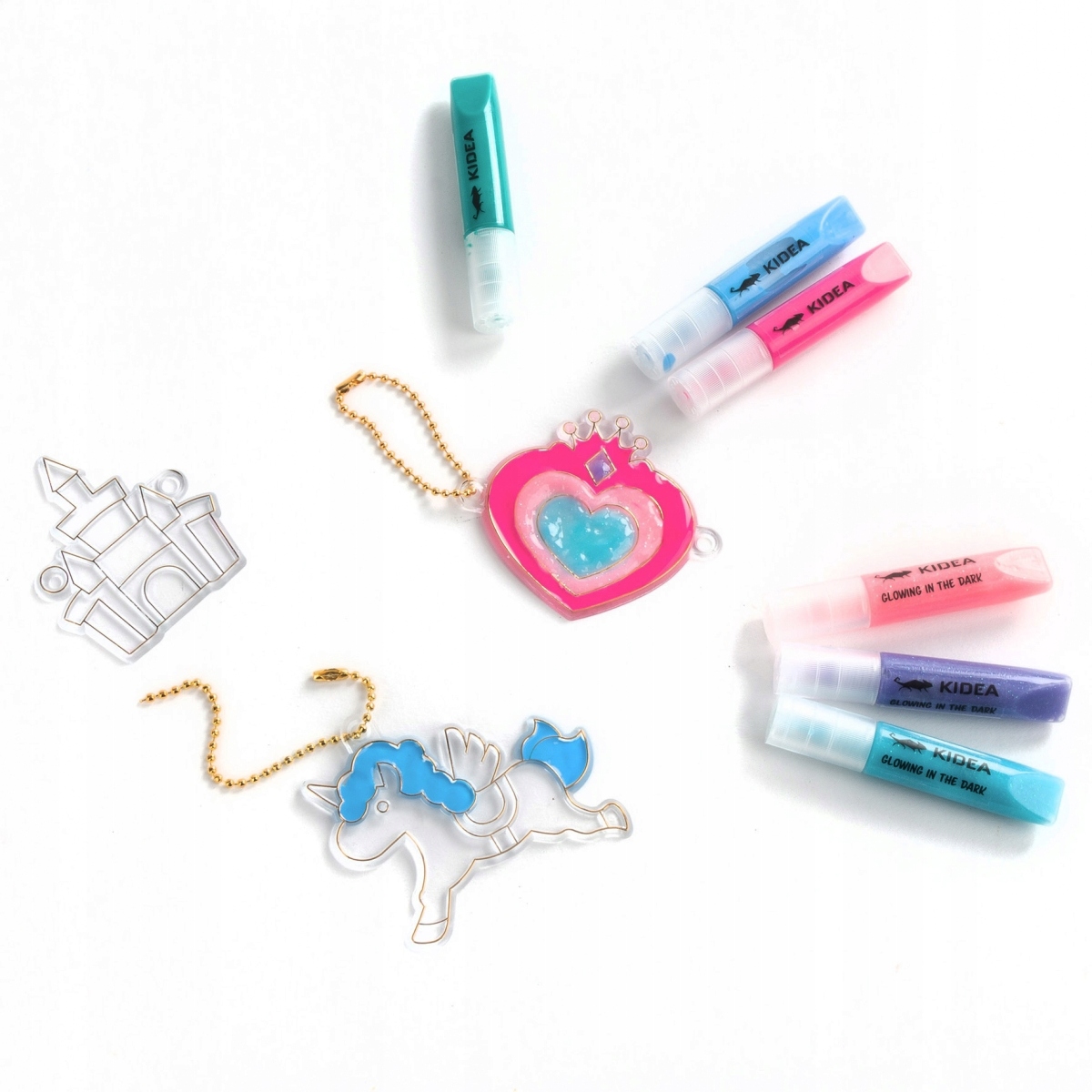 Перейдіть у світ магії з творчим набором підвісок Kidea ! 🌙 Чарівний набір містить мотиви єдинорога, серця та замку , які після наповнення гелем і сушіння починають світити в темряві - все, що вам потрібно зробити, - це освітлення 💫.