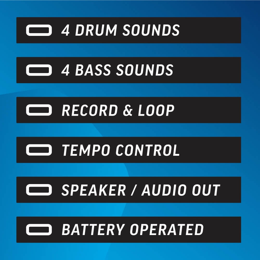 Грайте, торкаючись і переміщаючи підключений стилус на чутливій до дотику круглій бітпаді. Кожен сегмент на поверхні відтворює різний звук барабана чи басу з чотирьох унікальних звукових банків: ROK, TECHNO, HIPHOP і BEATBOX. Це легко грати, ідеально підходить для початківців і досвідчених музикантів!