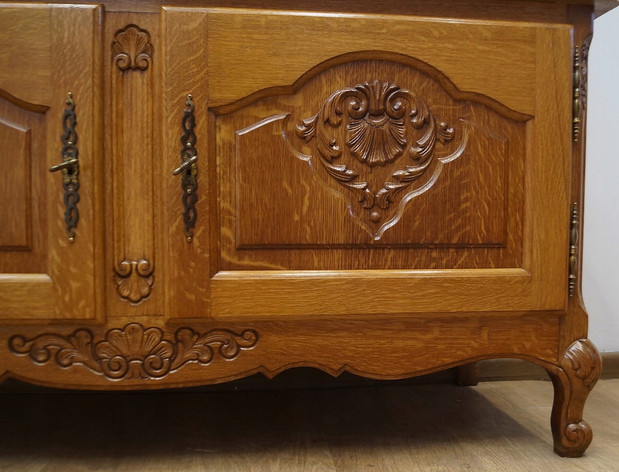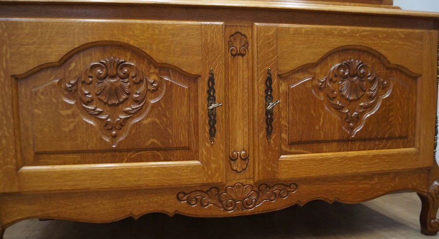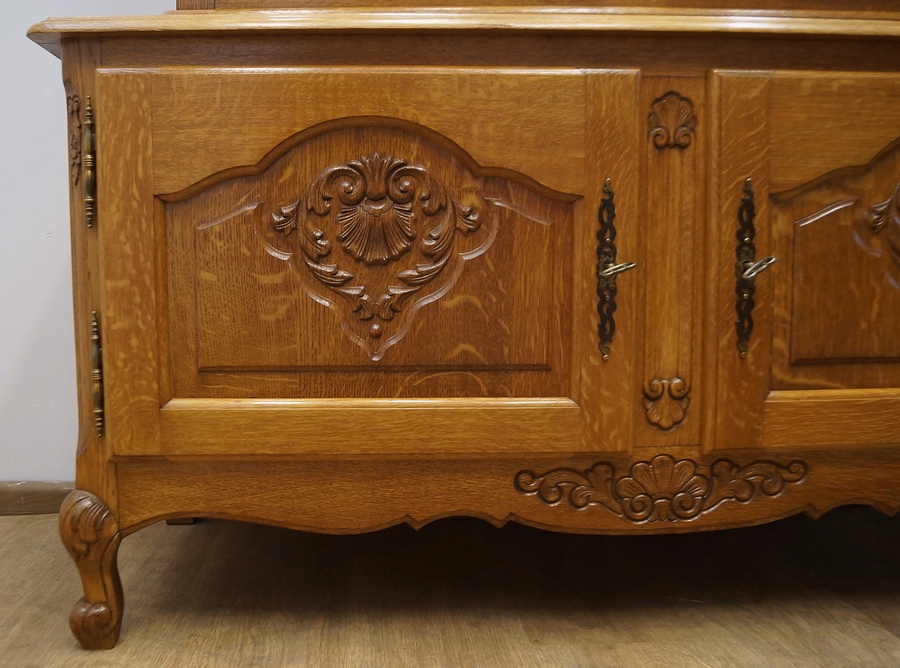 Вгорі дві двері засклені, вікна, прикрашені стовпами, завершальна арочна форма, завершена різьбленою раковиною. Двоє нижніх дверей, гарно різьблених. Вітрина прикрашена чудовим різьбленням і спирається на красиві ніжки кабріоля. Низ оброблений декоративним воланом. Красиві різьблені елементи роблять цей предмет меблів унікальним та особливим.