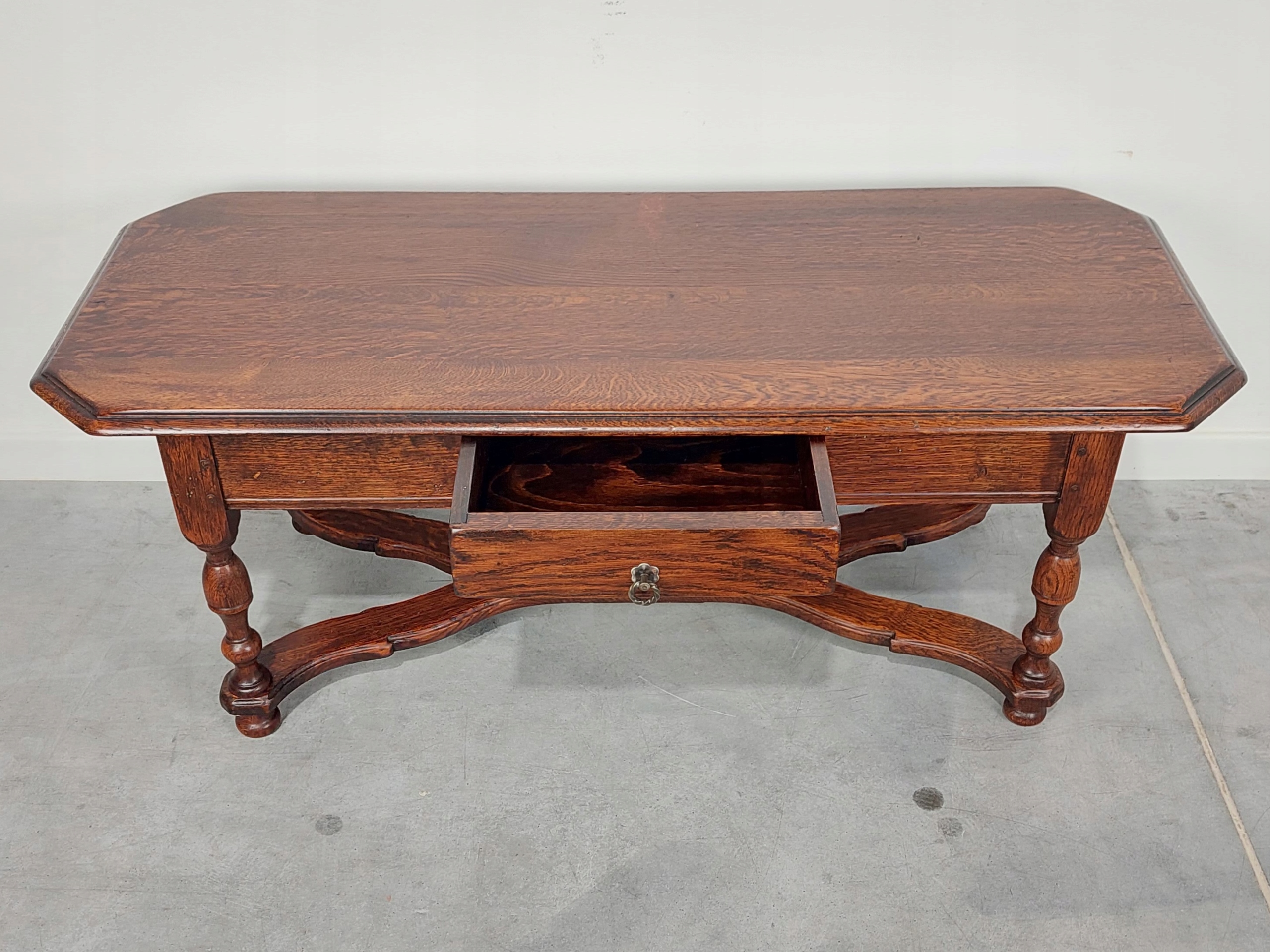 Стильна дубова голландська лава/стіл з ящиком. Меблі з масиву дуба, шип. На стільниці є сліди використання, тобто подряпини, потертості, зміна кольору, сліди ремонту. меблі деформовані, структурно жорсткі, але все це може трохи хитатися. Деталі показано на фотографіях нижче