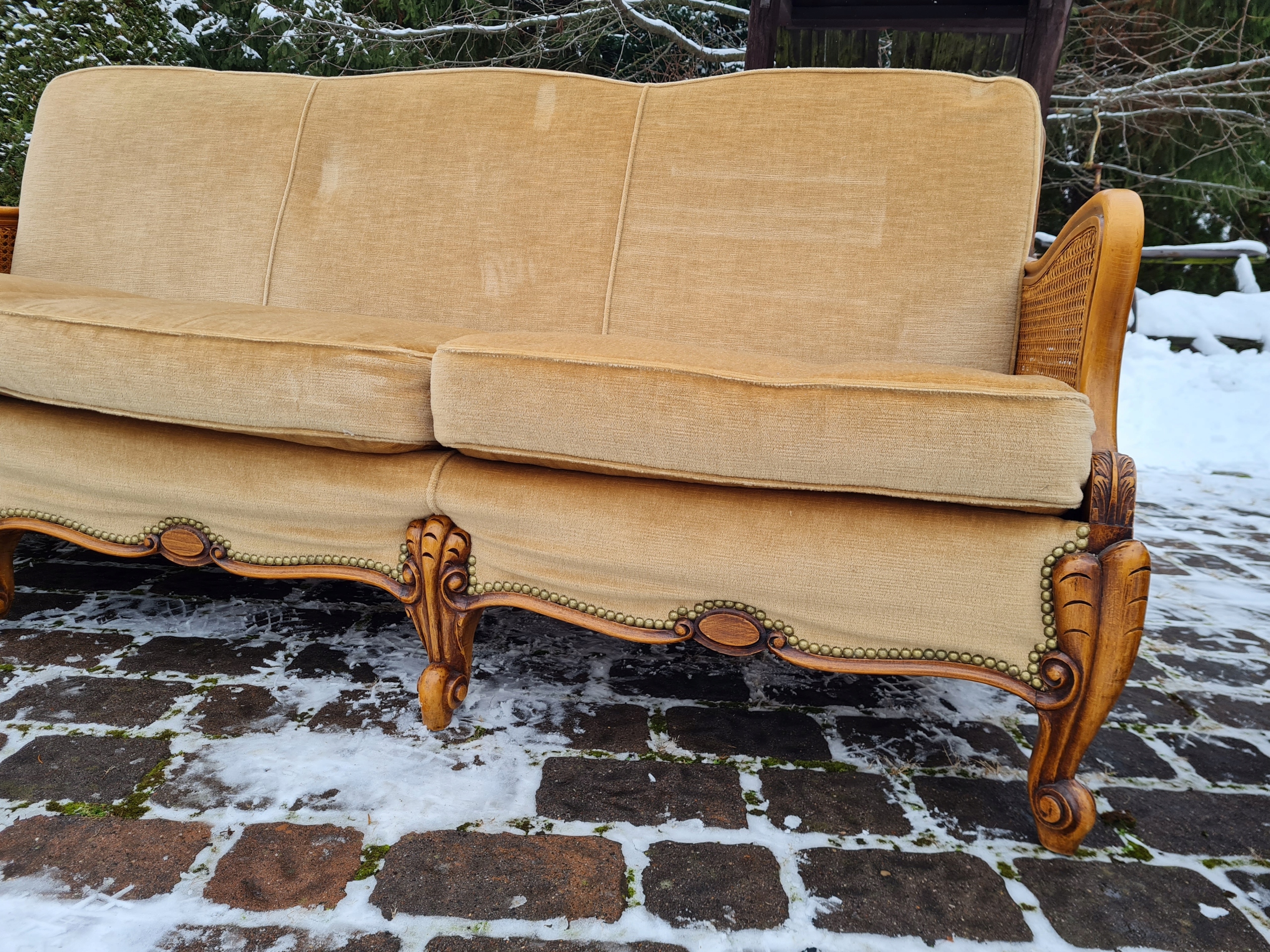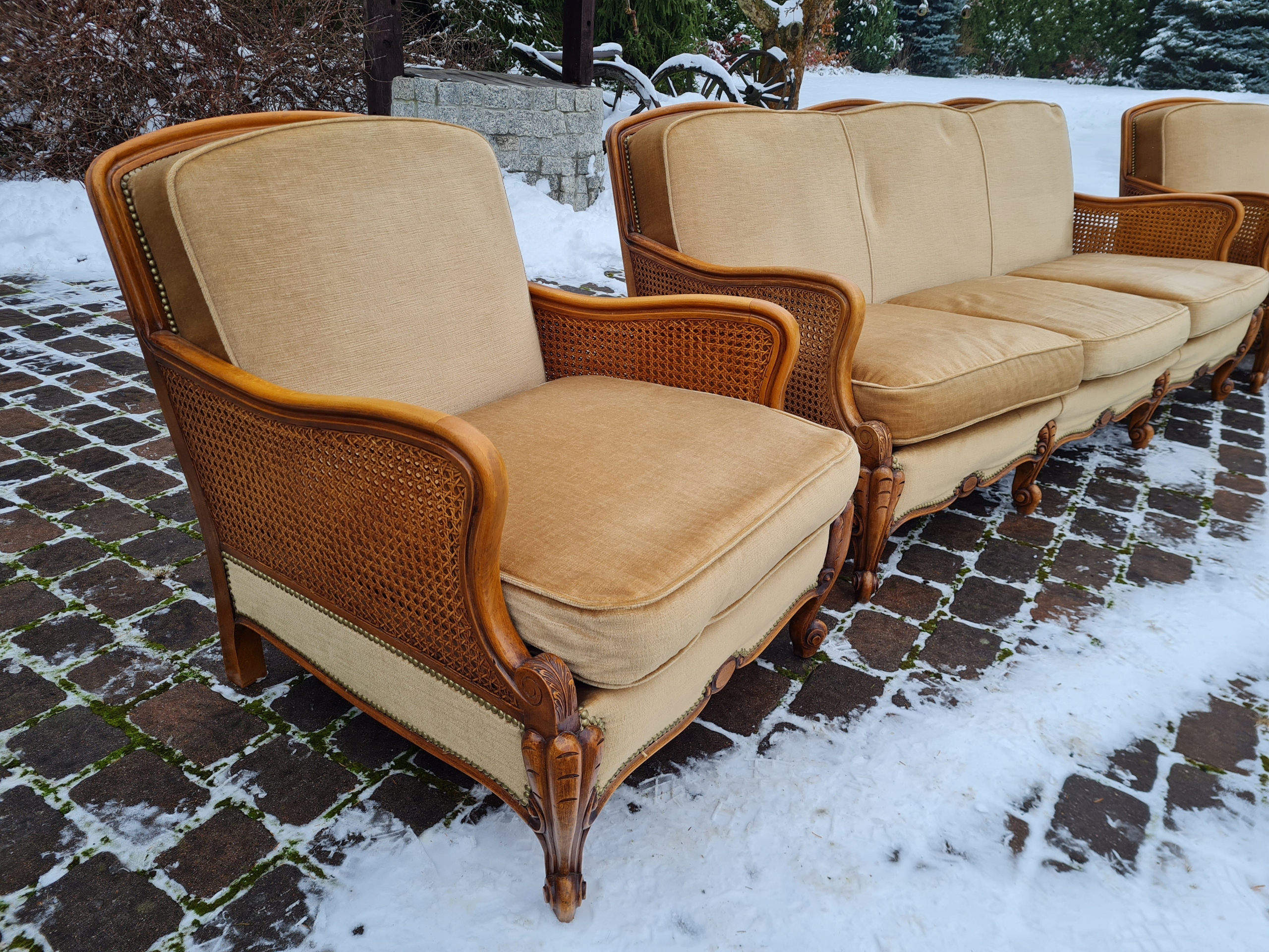 Диванний гарнітур Красиво оздоблений деревом і ротанговою сіткою. Велюрова оббивка.