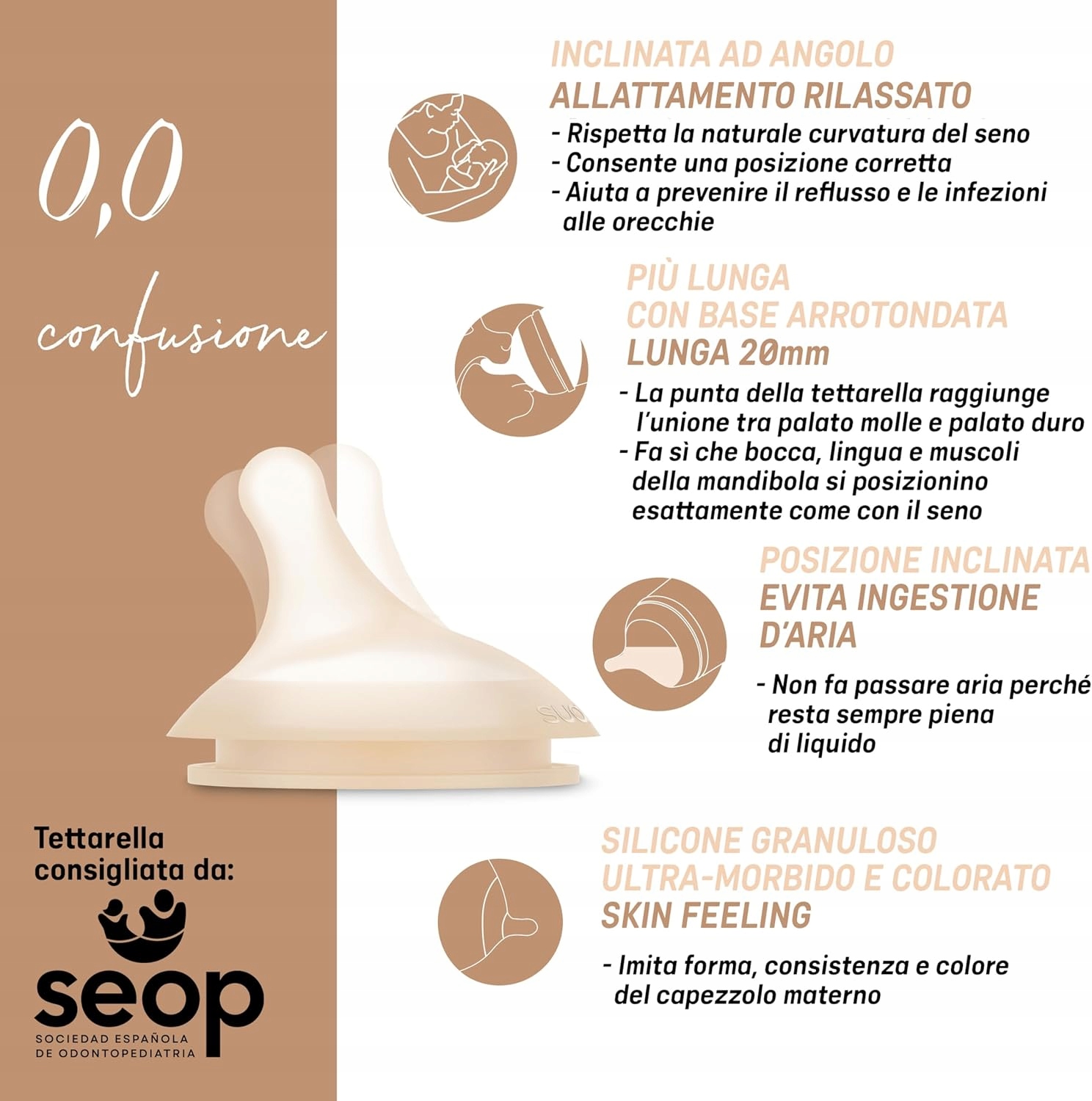 Полосаток для новонароджених, соска для новонароджених нуля. Цей міні -розмір, виготовлений повністю з силікону та з симетричним SX Pro Teat, рекомендується дітям від -2 місяці до 2 місяців, першого соску. Цей пустушник вказується в перші дні дітей та для дітей з низькою вагою, навіть передчасні немовлята (неісно -госпітальне використання). Задовольняє потреби новонародженого, як ніколи: