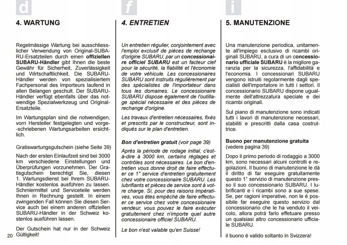 Tribeca, Legacy, Outback, Forester, lmpreza, Justy Версія книги трьома мовами - італійською, німецькою, французькою