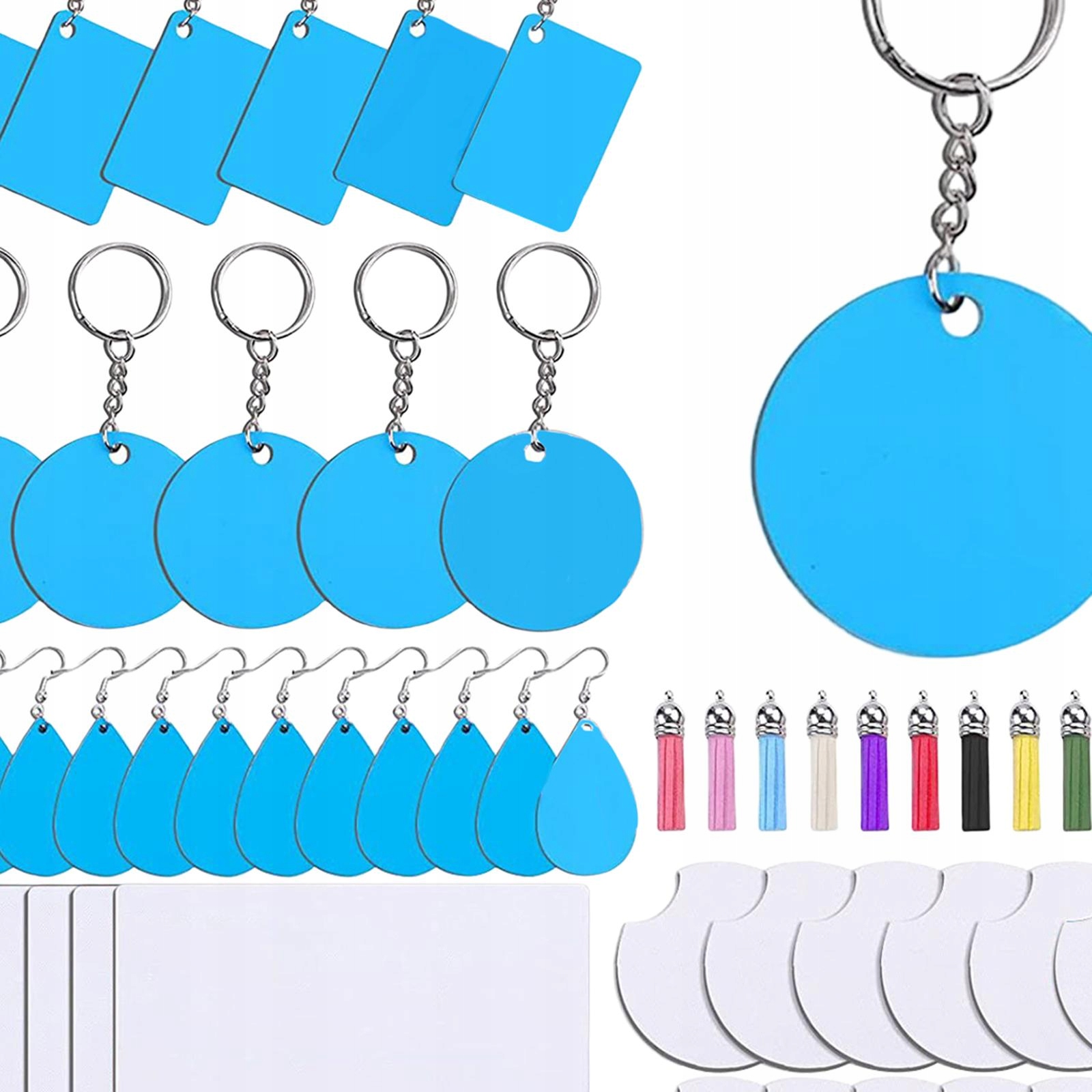 Пакет включає: 12 порожніх сублімованих підставок, 6 порожніх сублімованих килимків для миші, 6 круглих сублімованих брелоків, 6 прямокутних сублімованих брелоків і 12 (6 пар) порожніх сублімованих сережок.