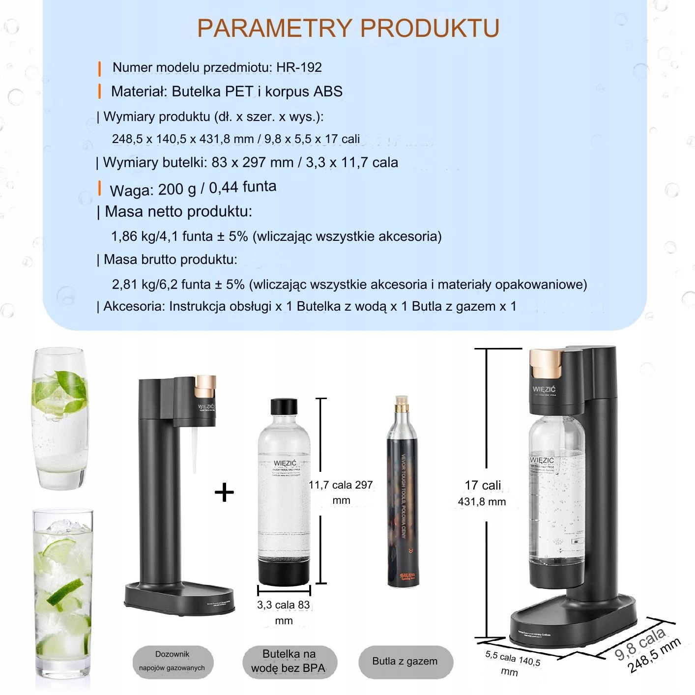 Використання генератора надзвичайно просте: просто наповніть пляшку чистою холодною водою, накрутіть в циліндр CO2 і натисніть кнопку карбонізації на 2-3 секунди, щоб насолодитися прохолодним блискучим напоєм. Не забудьте використовувати холодну воду (4-5 ° C) для кращого впливу бульбашок та смаку.