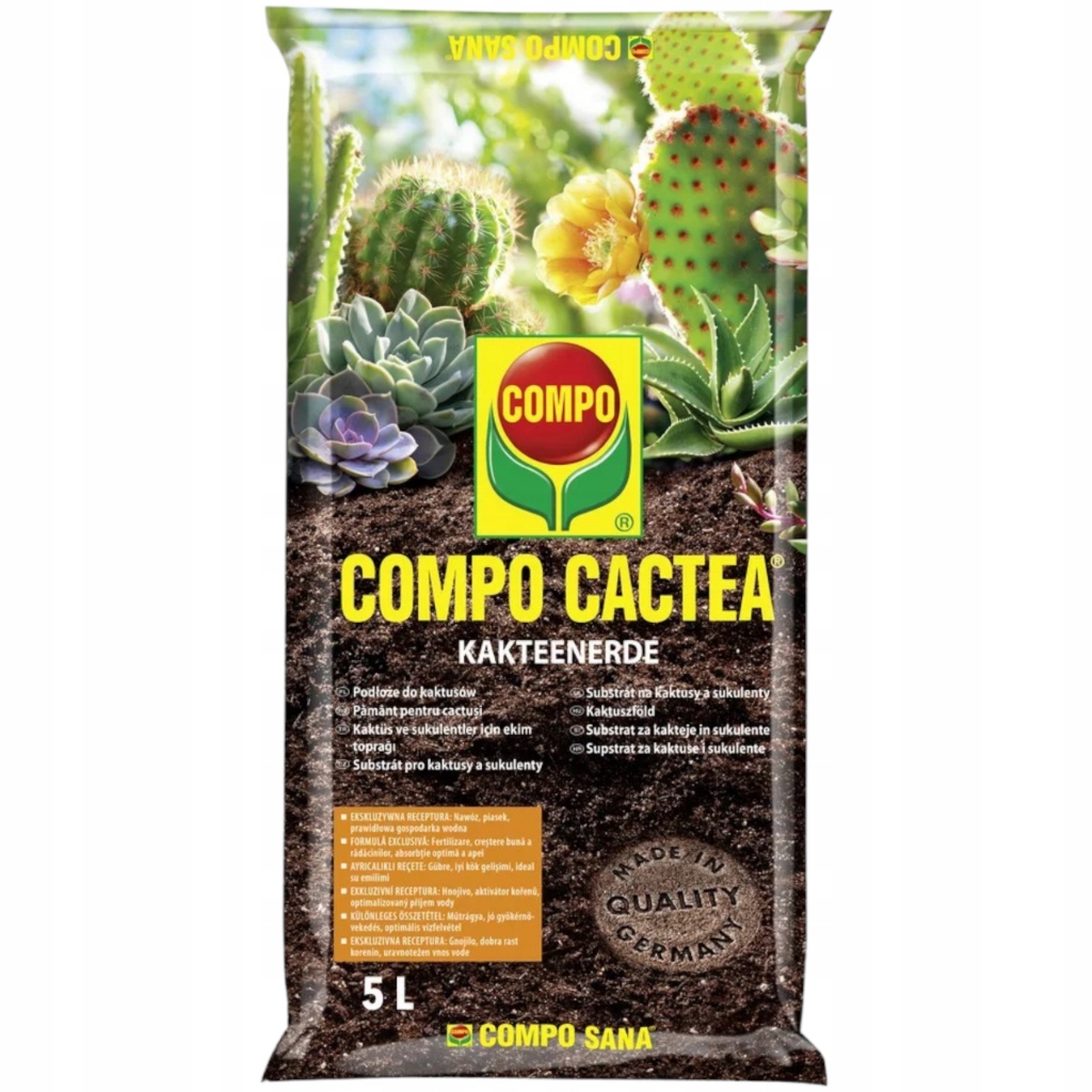 Субстрат COMPO SANA для кактусів і сукулентів розроблено з сировини найвищої якості, що робить його не тільки ефективним, але й безпечним для рослин. Це надійний вибір для кожного ентузіаста вирощування кактусів і сукулентів.