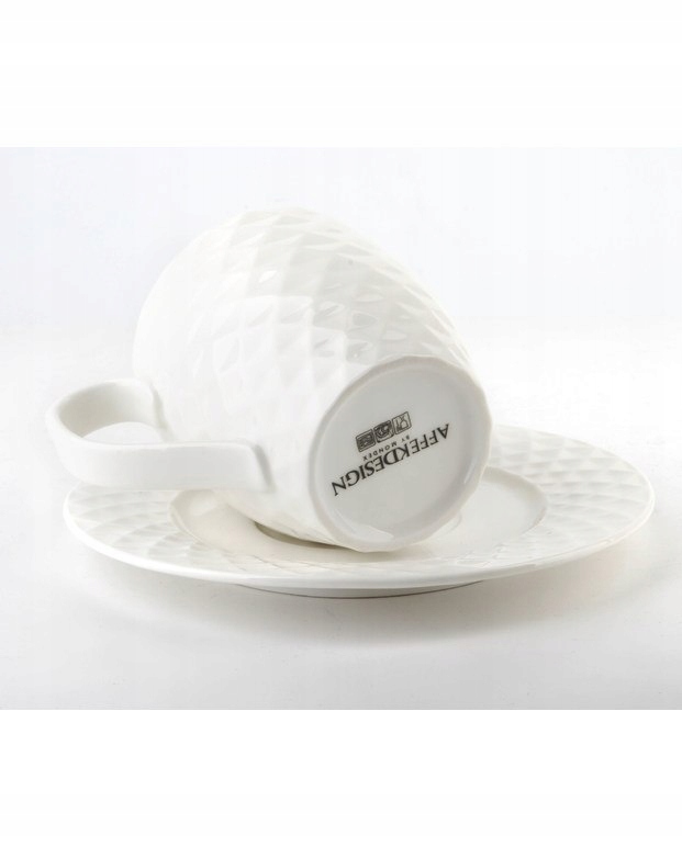 чашка з тарілкою з діамантового порцелянового ряду. Він прикрашений делікатним тисненням на ромб, це, безумовно, буде приємніше, випивши каву. Чашку можна вільно мити в посудомийній машині та використовувати в мікрохвильовій піч, що сприятиме щоденному використанню. Порцелян, що використовується для його виробництва, високої якості, а сама чашка упакована в декоративну упаковку. Поле