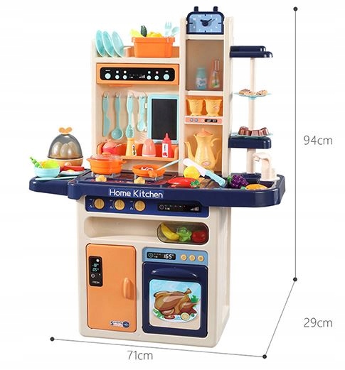 ХОЛОДНА ПАРА, ЗВУКИ ПІД ЧАС ГОТУВАННЯ, ВОДА - Кухня видає реалістичні звуки та звуки, відомі під час приготування їжі, такі як смаження та булькання. Ліва конфорка має вбудований випарник, що дозволяє отримати ефект «холодної пари». Щоб отримати його, налийте приблизно 50 мл води в отвір на конфорці. Поставте каструлю, і через деякий час (коли вода «закипить») з каструль піде холодна пара. На кухні кран з помпою. Просто налийте воду в раковину, натисніть на насос і вода потече з крана! Це замкнутий контур. Дитина може полоскати фрукти, овочі та мити посуд! Усі функції викликають у дітей інтерес і спонукають до ігор.