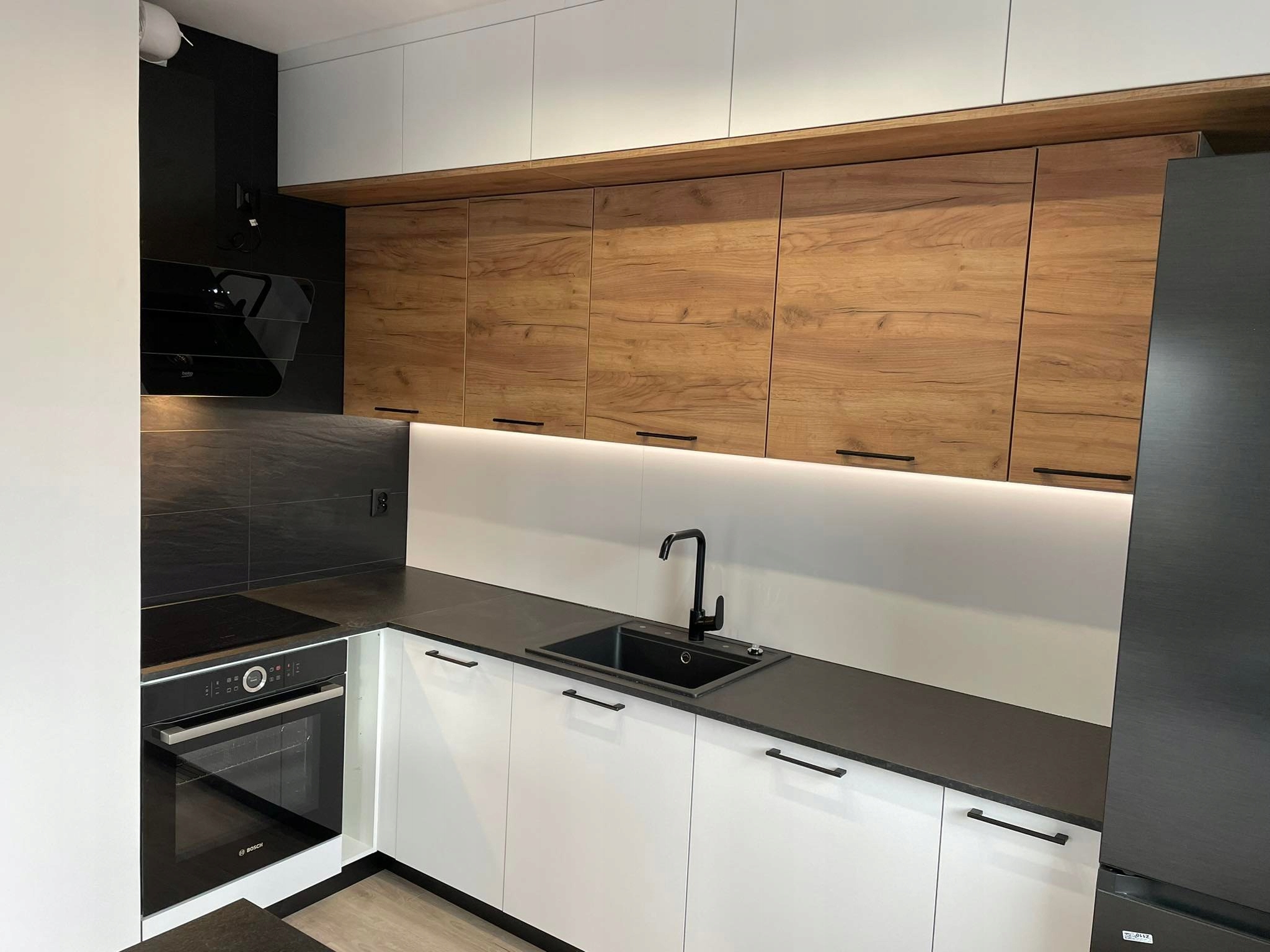 Цю кухню відрізняють сучасні ручки двох кольорів, які надають гарну лінію шафам, усе це робить меблі дуже сучасними та елегантними. Поєднуючи таку форму глянцевих білих фасадів із дерев’яними фасадами, ми можемо оптично збільшити кухню, надавши їй гармонії, елегантності та сучасного вигляду.