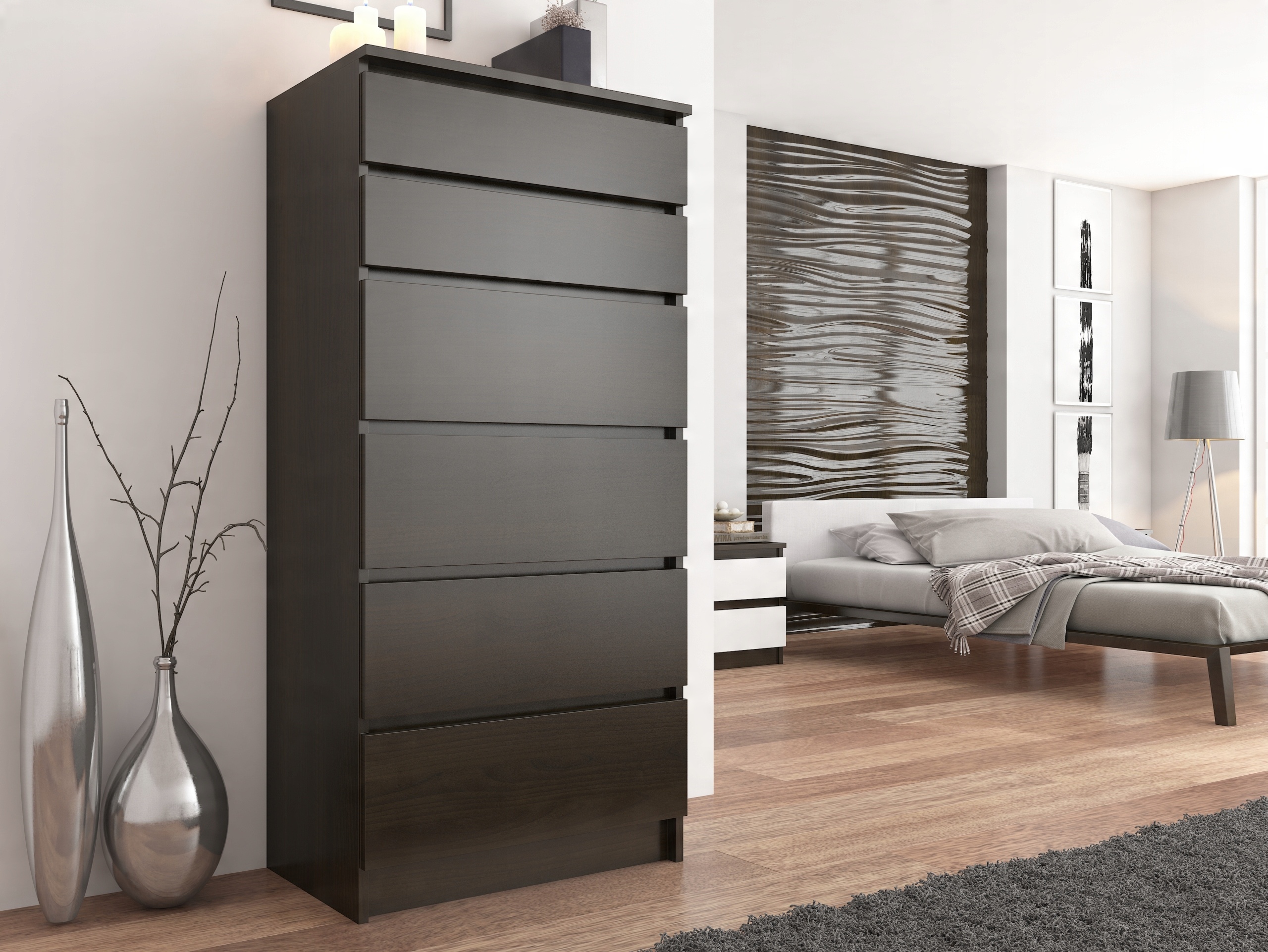 Стильний комод з колекції MODERN, створений для людей, які цінують сучасний стиль і елегантність. Оновить інтер'єр кожної спальні та вітальні. Дизайн мінімалістичний, але надійний і міцний. Завдяки фасадам ящиків без ручок, комод зручний у використанні. Ергономічні розміри комода надають свободу в облаштуванні кімнати.
