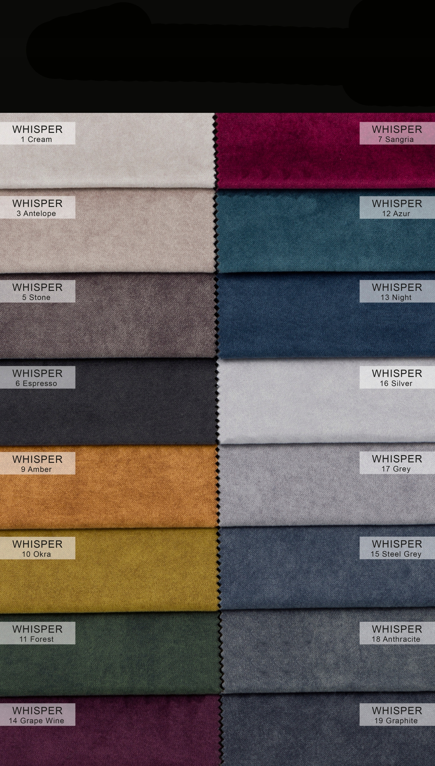 Колекція шепоту - це колекція гладких велюрових тканин. Структура цієї тканини рівномірна з тонко помітним відтінком текстури на її поверхні. Крім того, однорідна тканина, коли піддається світлу, акуратно світить.