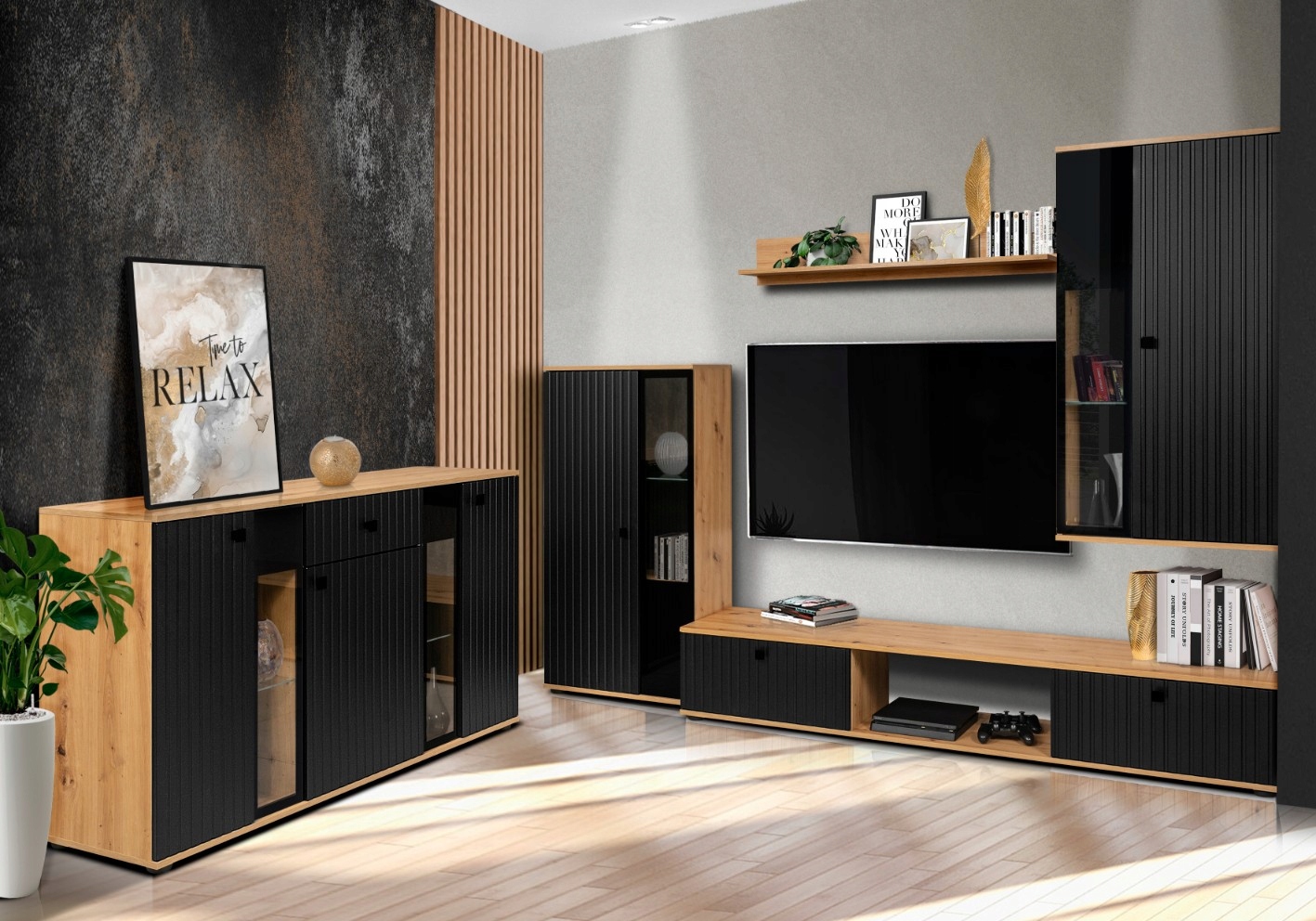 Сучасна стінка з телевізором SALVIA, ламелями, вітриною Artisan і Black Oak