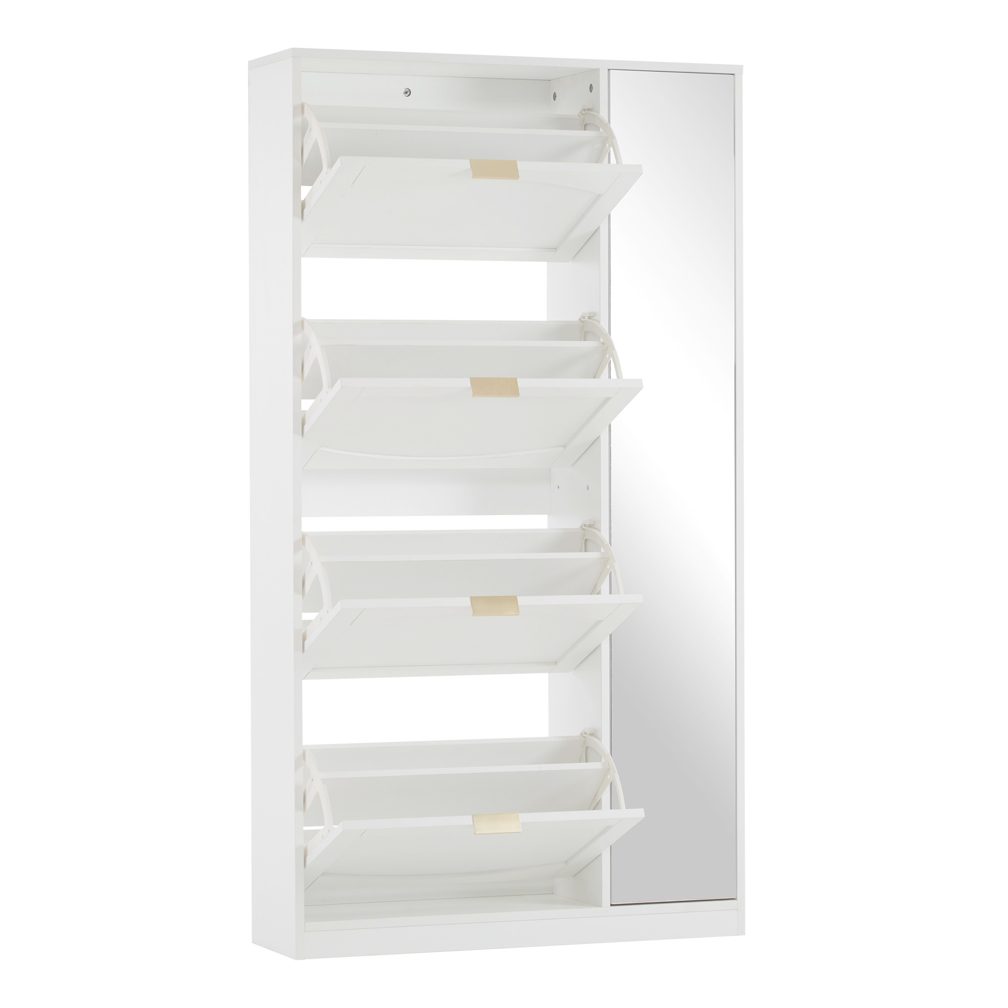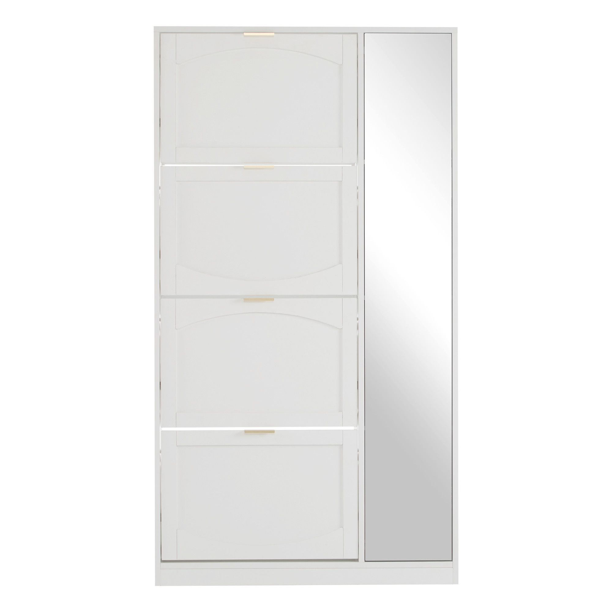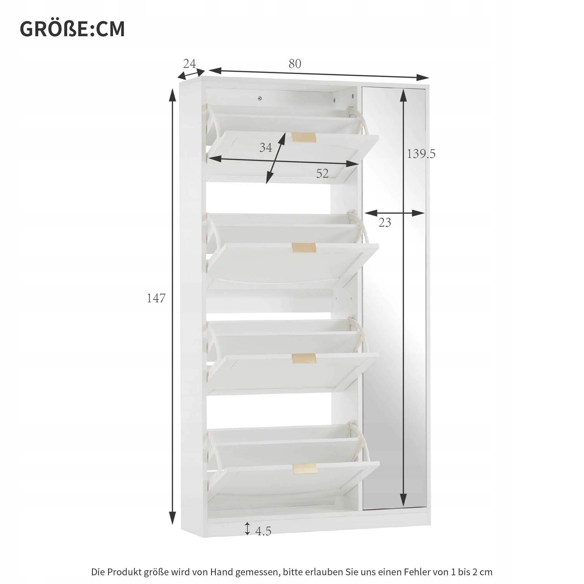 Сучасна тумба для взуття з дзеркалом, 4 відкидних відділення, регульована полиця за правим дзеркалом, ідеальна для передпокою, біла, розміри: ширина 80/висота 147/глибина 24 см