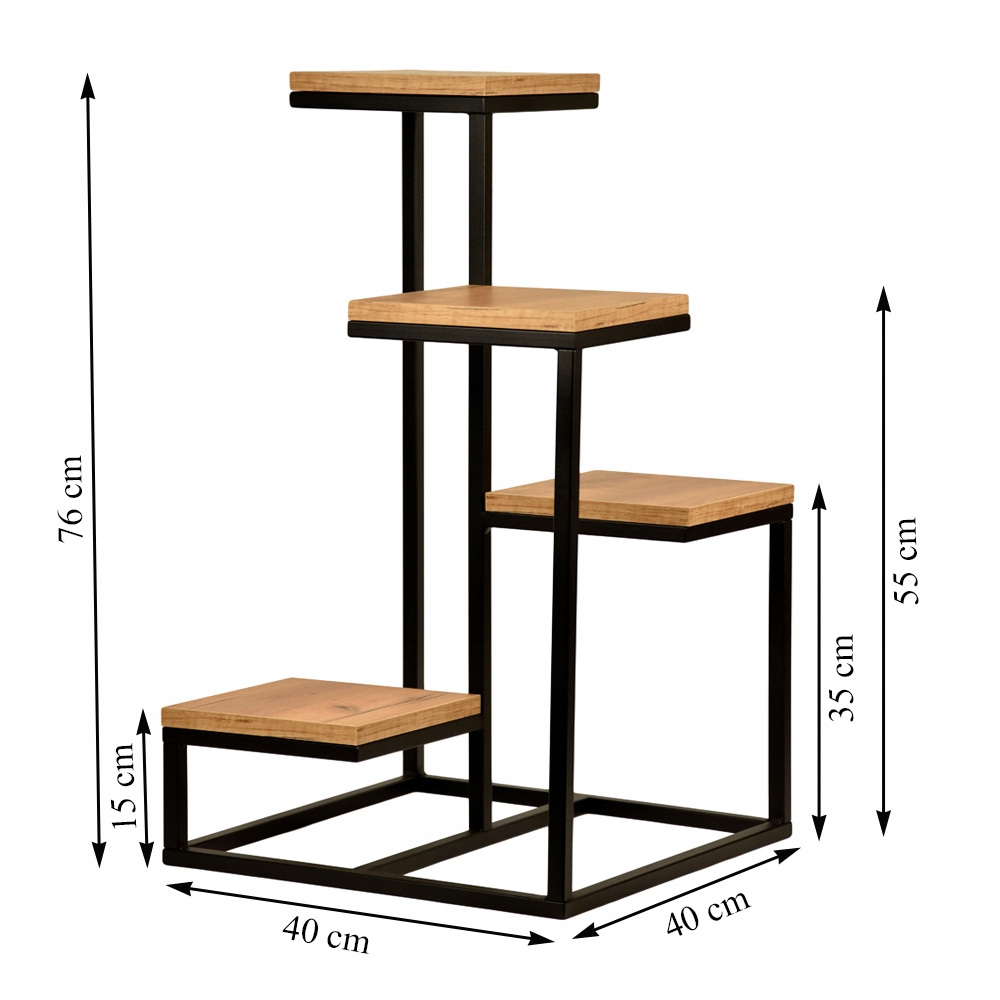 Велика стояча підставка для квітів, польського виробництва, міцно виготовлена та має красивий, простий і сучасний вигляд, конструкція підставки виготовлена зі сталевого профілю 16x16 мм, що гарантує стабільність . Підставка має три верхівки для квітів різної висоти, виготовлені з ламінованої дошки товщиною 18 мм з розмірами: три частини 20/20 см і одна частина 20/21,5 см.