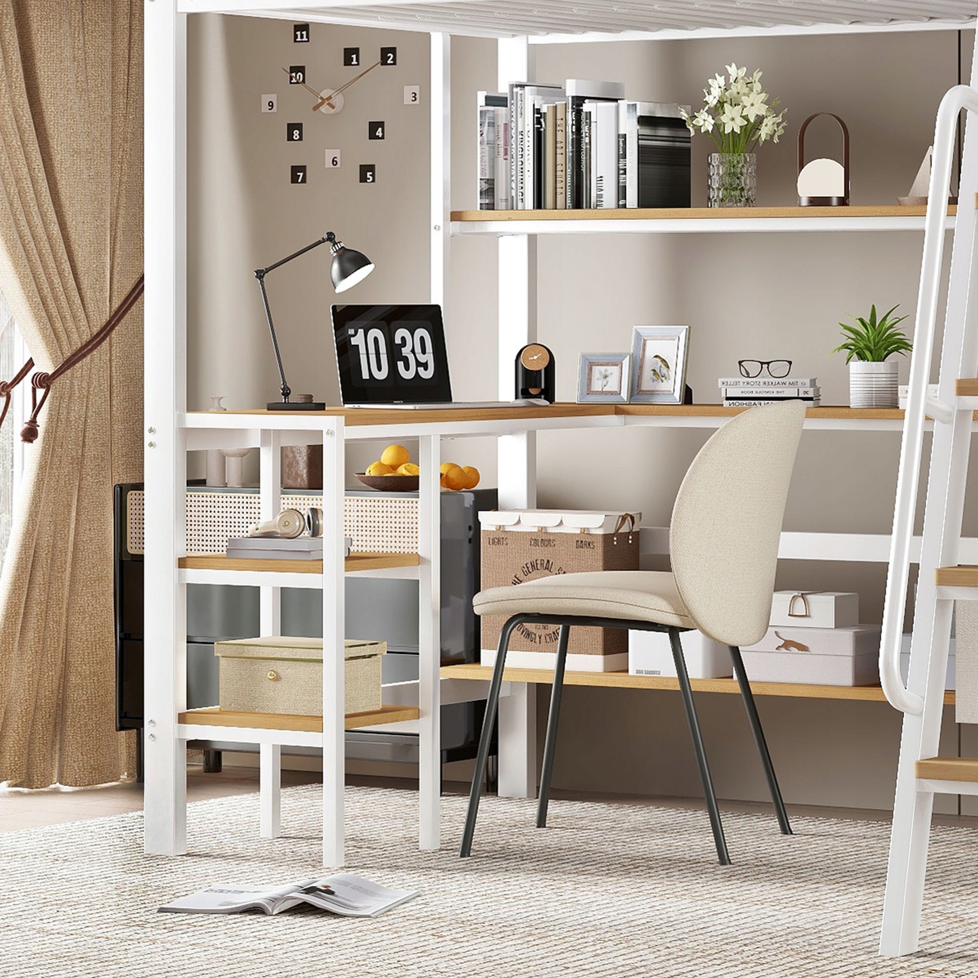 Ліжко залізне, двоярусне, з двома тканинними контейнерами, з письмовим столом і полицею для зберігання, чотириярусні похилі сходи, залізо + МДФ, білий + натуральний, 90x200 см