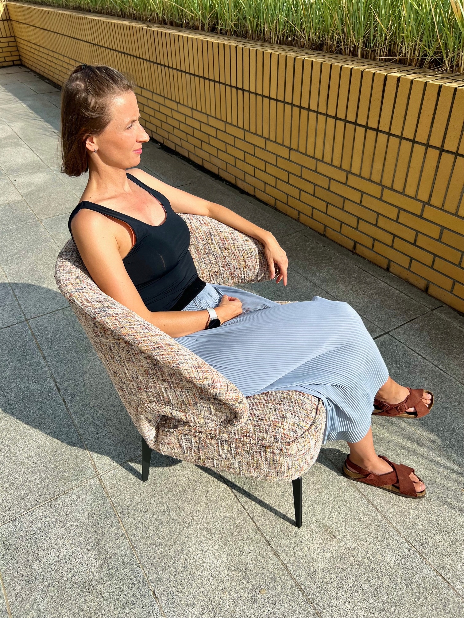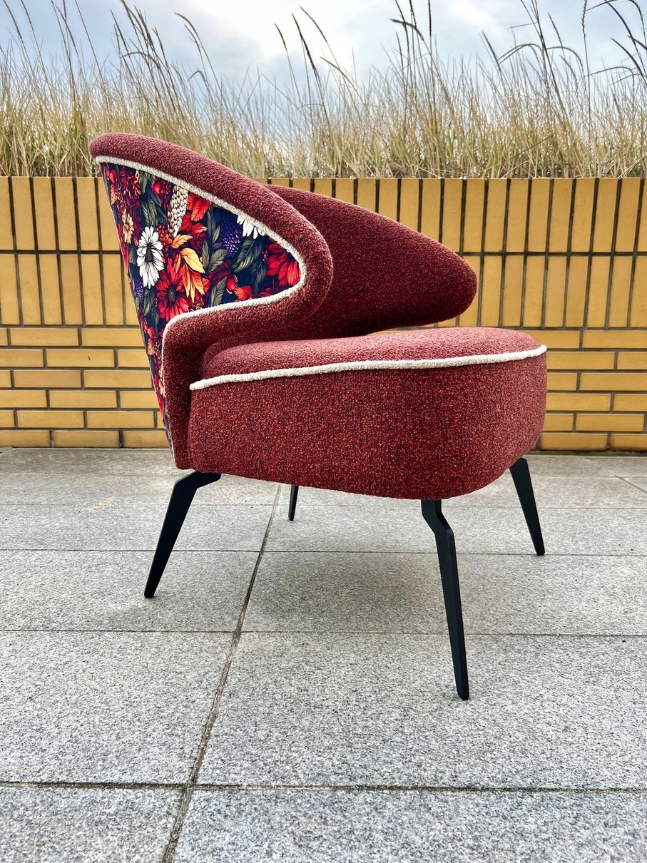 незвична форма стільця! Спинка обережно прямує вниз, будучи водночас підлокітником. Сидіння широке і глибоке. Сучасні чорні сталеві ноги додають усі ноти сучасних часів. Це поєднання класичної елегантності з сучасним дизайном робить це крісло стане незвичайною меблями.