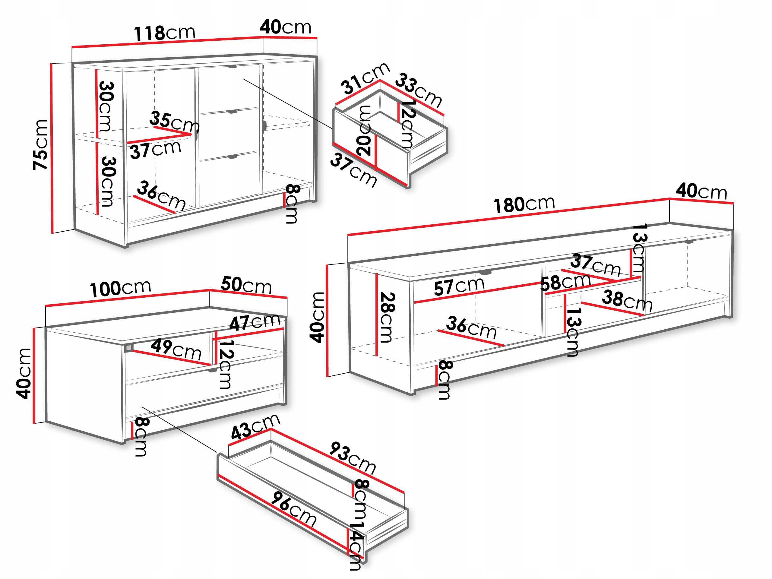 - rtv шафа Tireno 2K: Ширина: 180 см, висота: 40 см, глибина: 40 см,