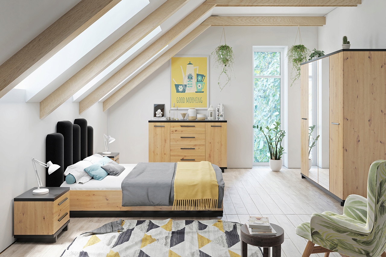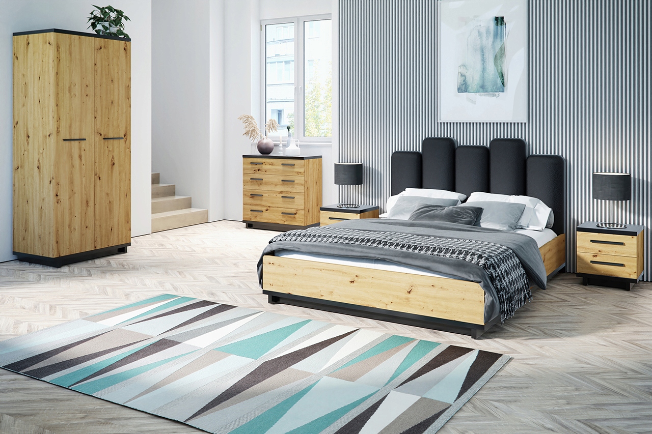 Двокімнатні меблі INES в індустріальному стилі ідеально підійдуть в сучасних спальнях. Колекція меблів INESце поєднаннянатуральних кольорів, практичних форм і промислового дизайну. Завдяки теплим кольорам натурального дерева в поєднанні з чорним, меблі INES дозволять створити сучасне облаштування кімнати з практичним дизайном.