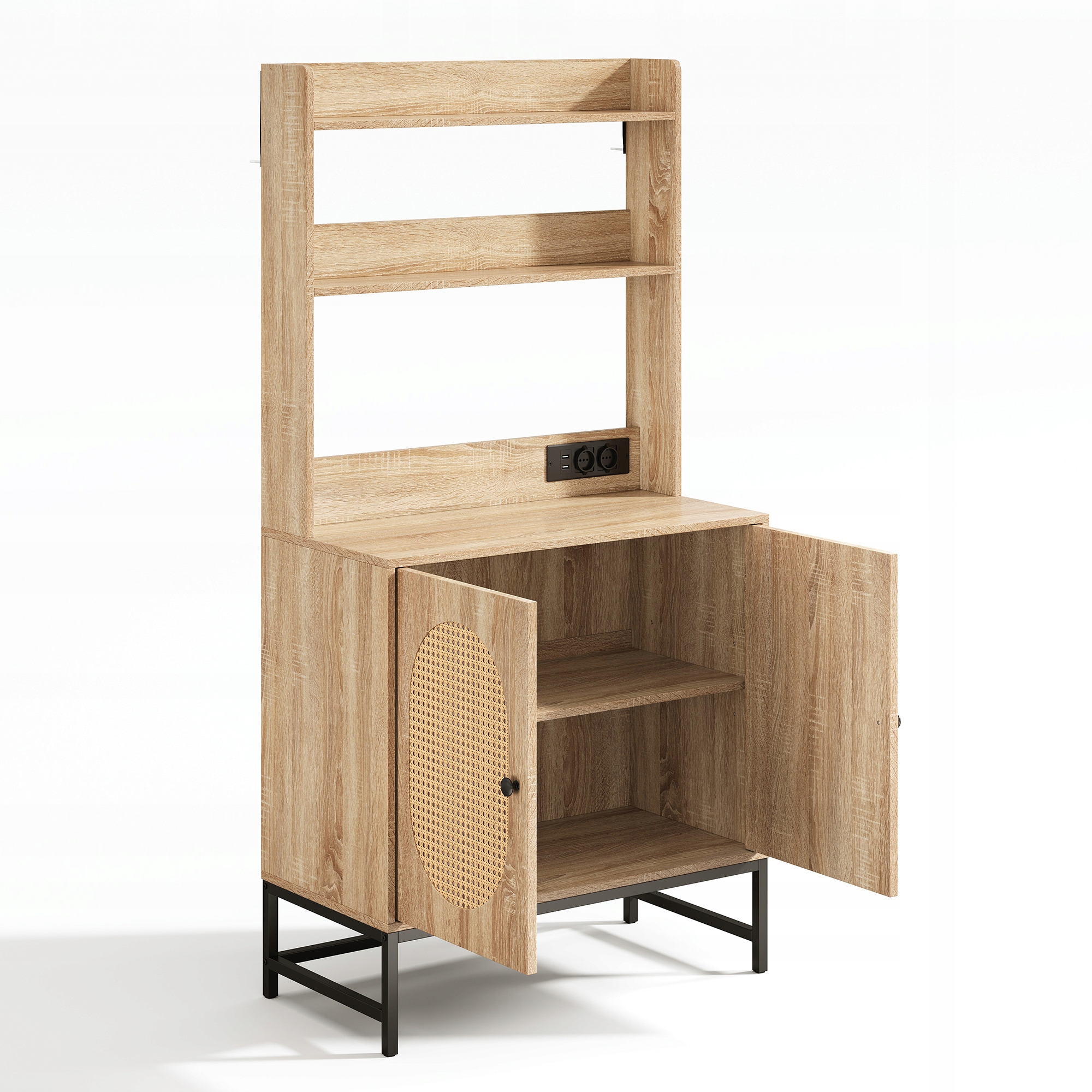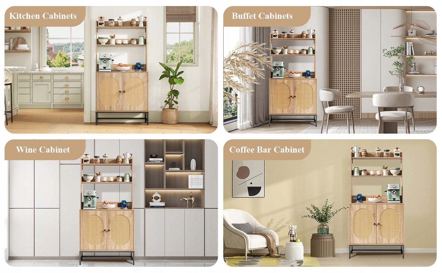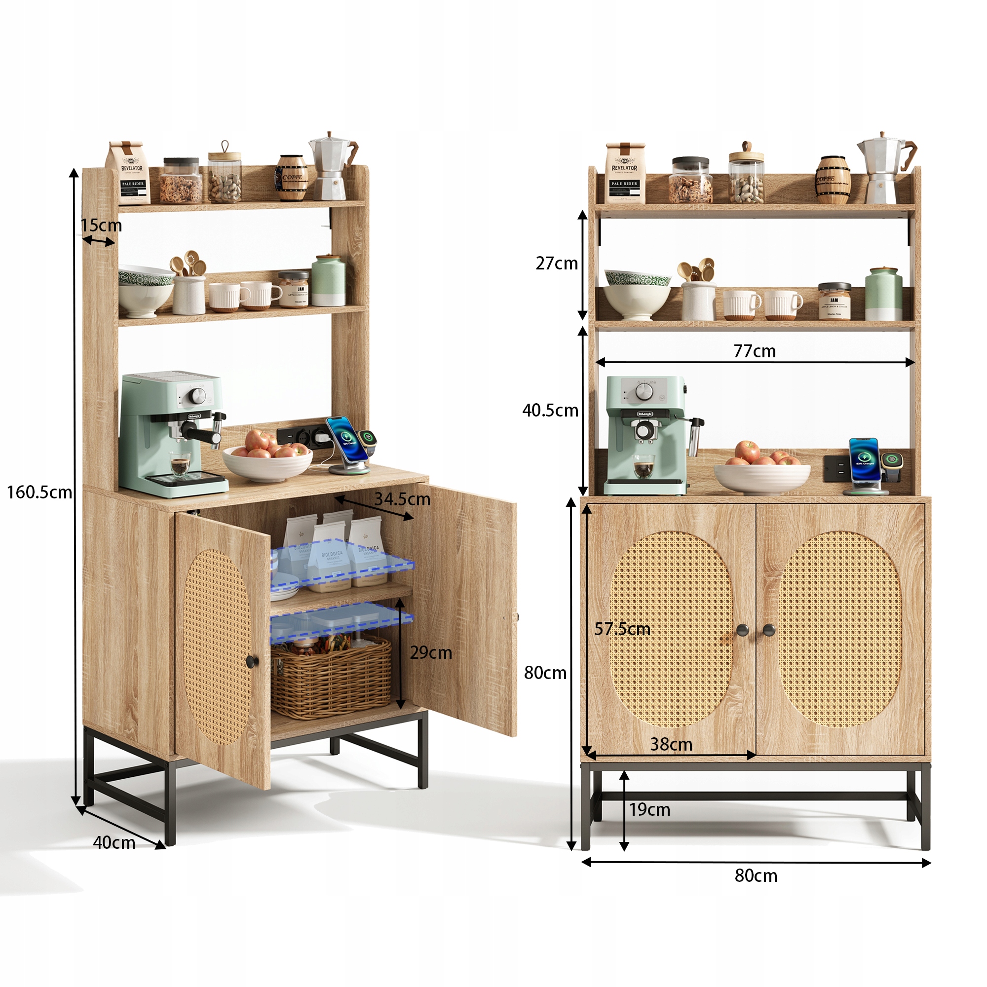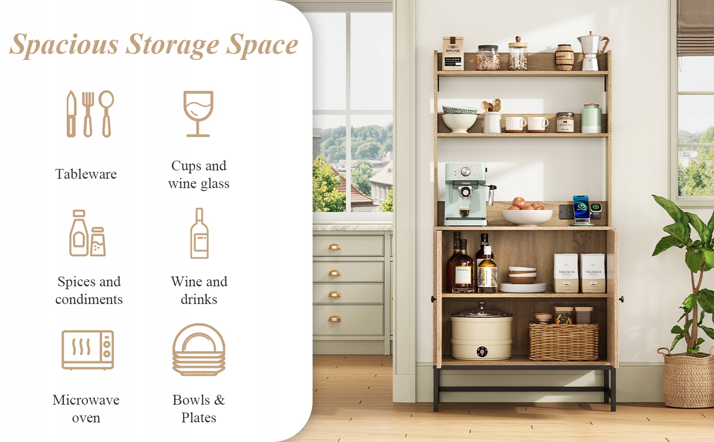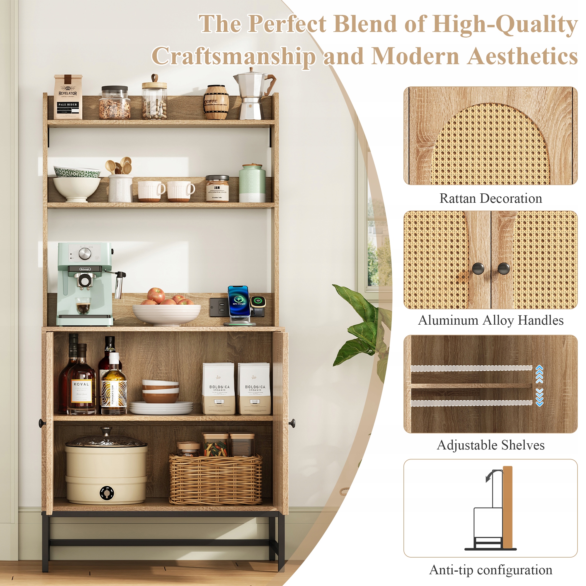 - ✅ Поєднання відкритого та закритого місця для зберігання: два вони забезпечують швидкий доступ до страв, спецій або прикрас. Нижня шафа з регульованою полицею забезпечує гнучкі рішення для зберігання предметів різного розміру.