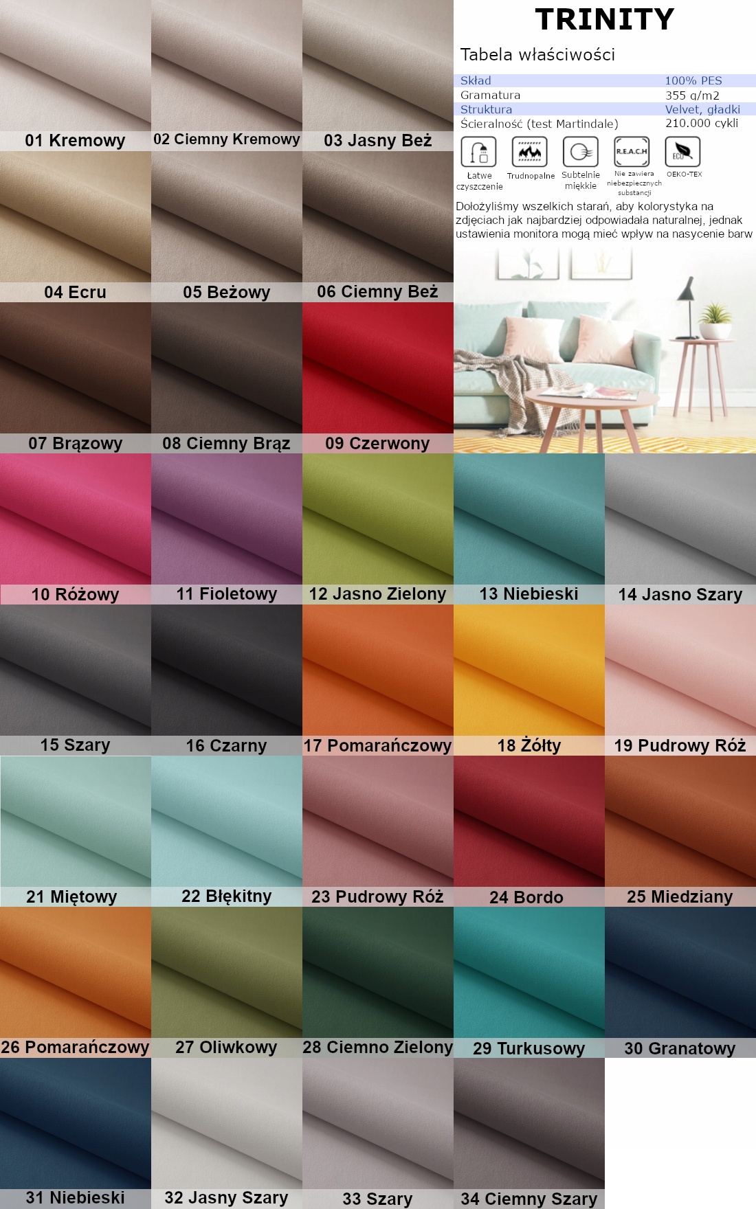 - TRINITY - м'яка і приємна на дотик велюрова тканина з високою стійкістю до стирання і світла. Тканина покрита ніжним ворсом. Завдяки покриттю WATER BLOCK обмежено поглинання рідини. Легко підтримувати в чистоті.