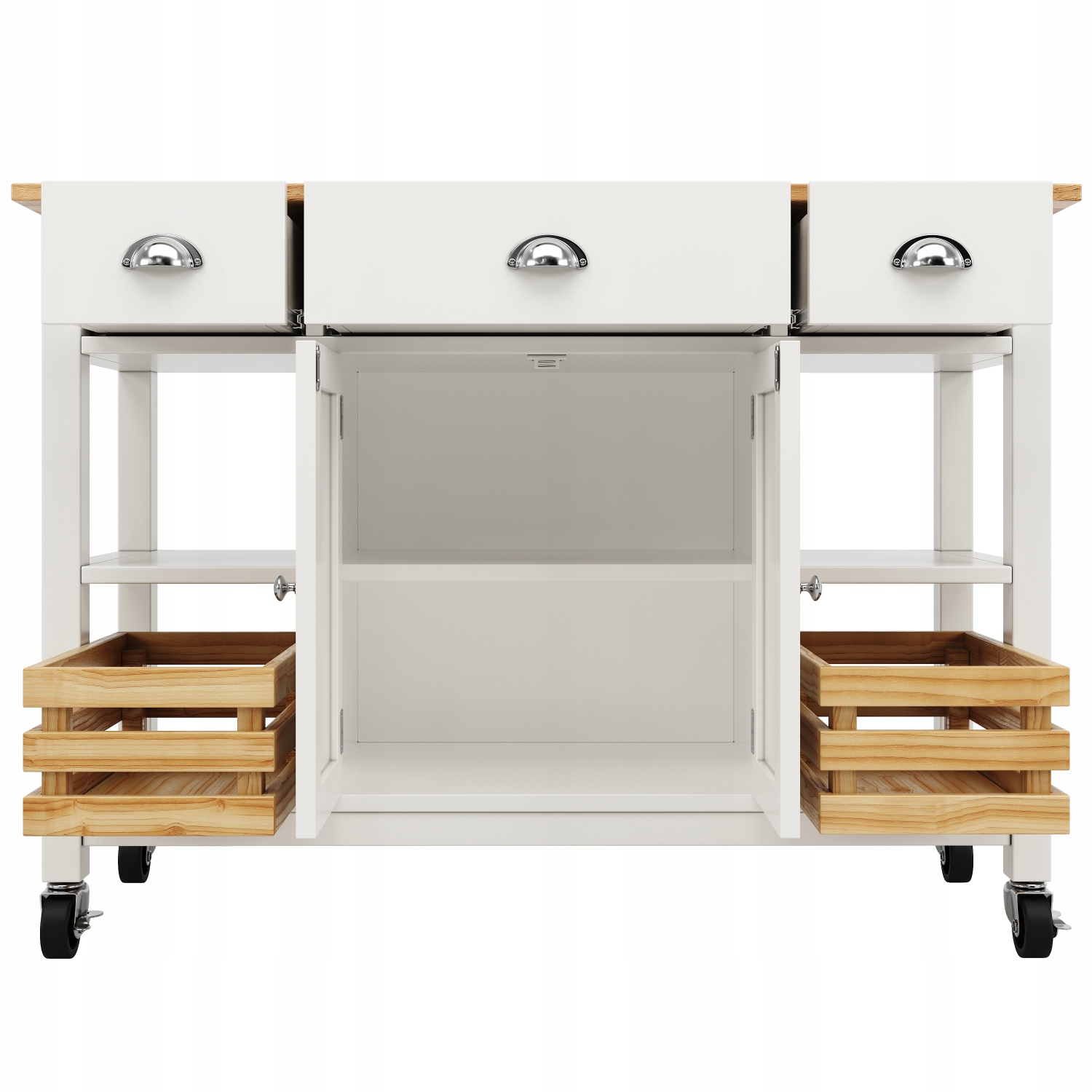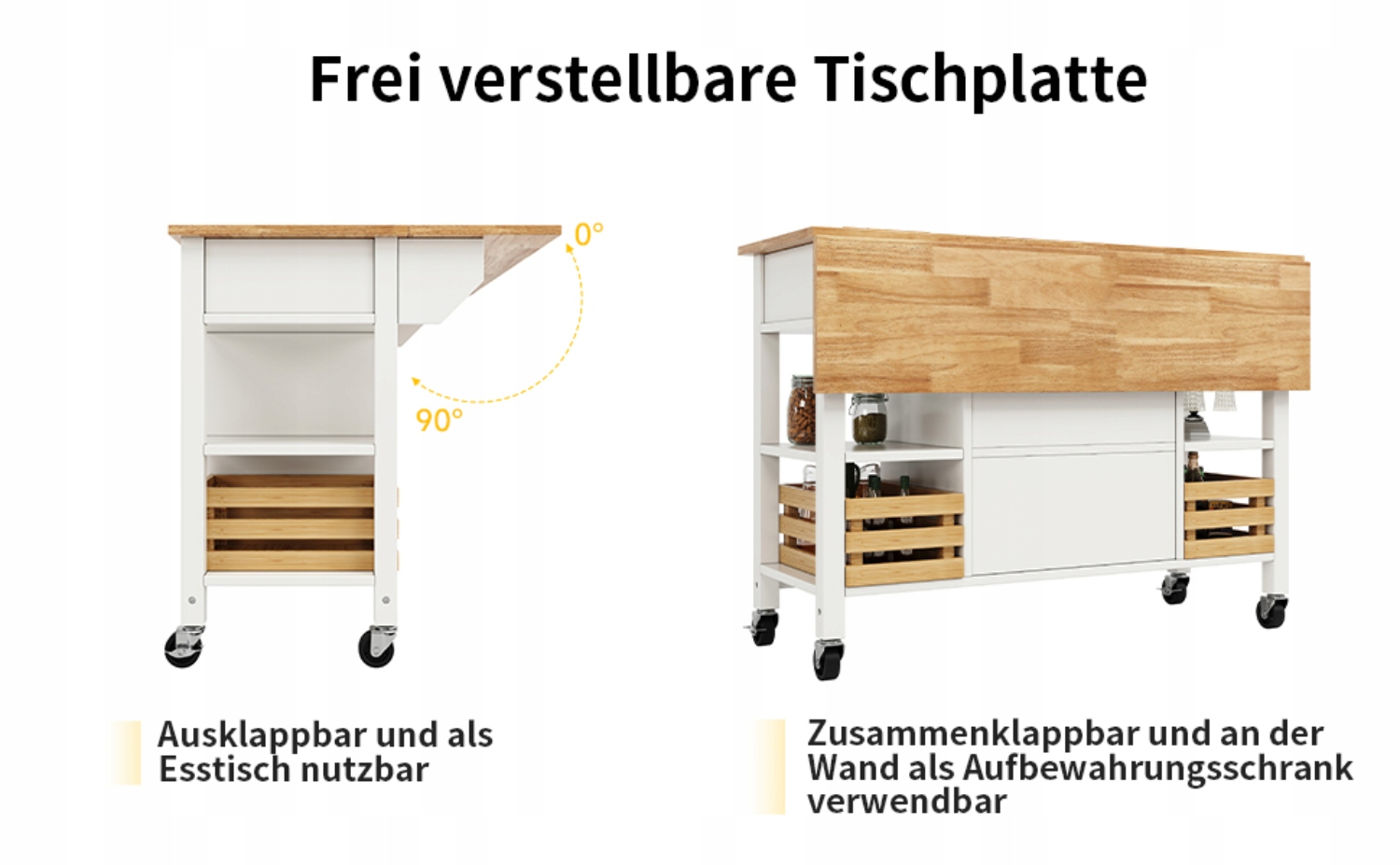 Розміри: Кухонний острів має довжину 120 см, ширину 45 см і висоту 90 см. Боки цього кухонного візка складаються та розкладаються, щоб служити обіднім столом. Загальна довжина сторін в розкладеному вигляді 73 см.