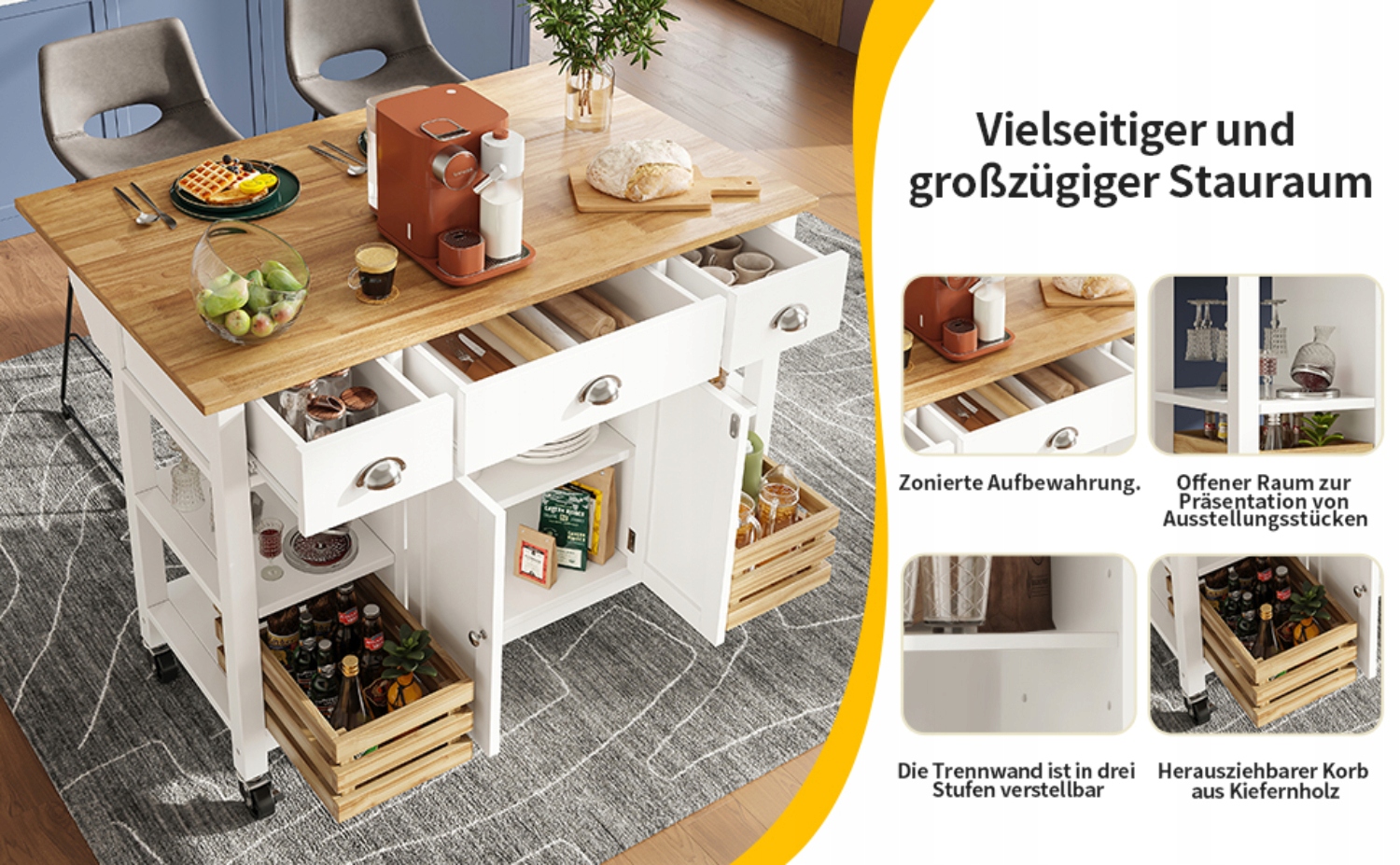 Пропонує універсальний і просторий простір для зберігання різноманітного кухонного начиння. Будь то каструлі та сковорідки, інгредієнти, спеції чи закуски, все це легко зберігати. У набір також входить висувний сосновий кошик для зручного доступу до напоїв, їжі та інших речей. Внутрішня частина поділена на відділення, що дозволяє розміщувати різні предмети в окремих місцях, полегшуючи їх сортування та пошук.