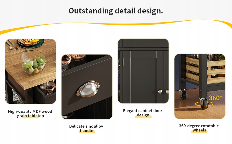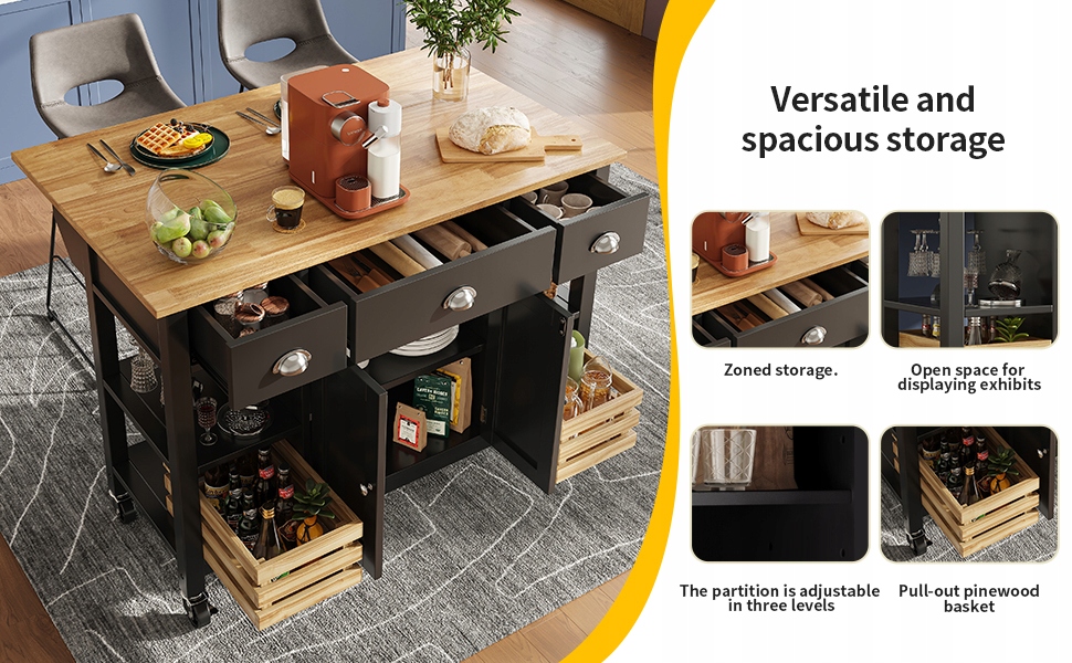 - Він має багатофункціональний і місткий простір для зберігання, який може вмістити велику кількість кухонного начиння. Будь то каструлі та миски, інгредієнти та спеції чи різноманітні закуски, все можна легко зберігати. Ця модель також має висувний сосновий кошик для легкого доступу. Напої, їжа тощо.
