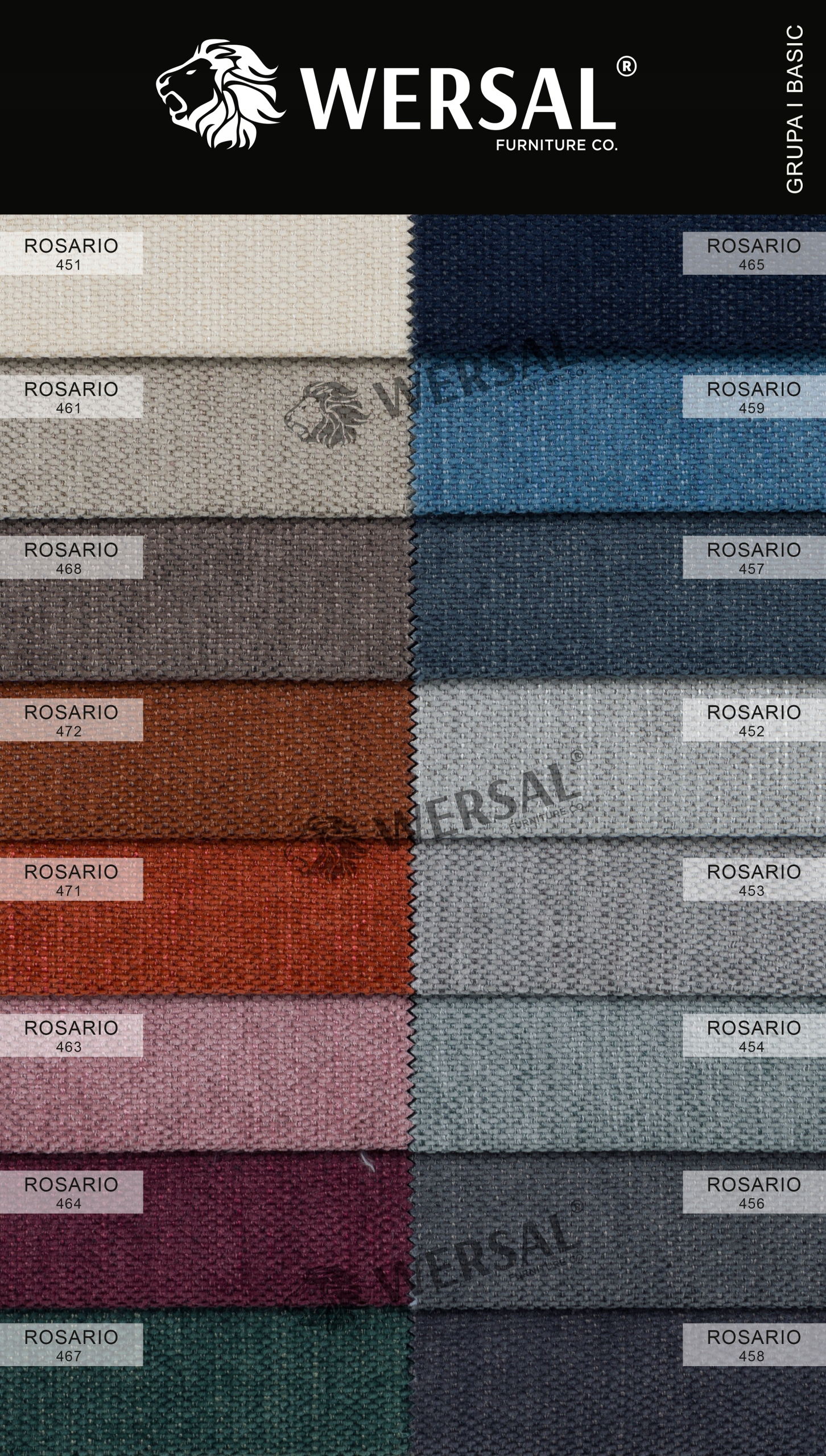 Rosario- тонкотканий структурний матеріал з ніжним двокольором, створений за допомогою ниток різних відтінків. Завдяки високій міцності його головним призначенням є меблі для відпочинку, хоча він також добре підійде для менших декоративних аксесуарів, таких як подушки, покривала чи підголівники.