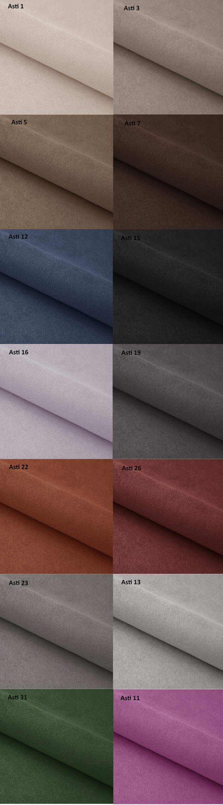 Asti - оббивна тканина з гладкою з ніжним малюнком надзвичайно м'якої поверхні. Матеріал з оббивки легко очищає та дихає, алергію -дружно, завдяки якому виготовлені меблі будуть легко та комфортно обслуговувати. Тканина оббивки знаходиться в насиченому виразному діапазоні кольорів, які є сильними та виразними. Тканина стійка до помітного та стирання, тому вона ідеально працює на м'яких меблях, диванах, кріслах, кушетках, пуфах та на подушках.