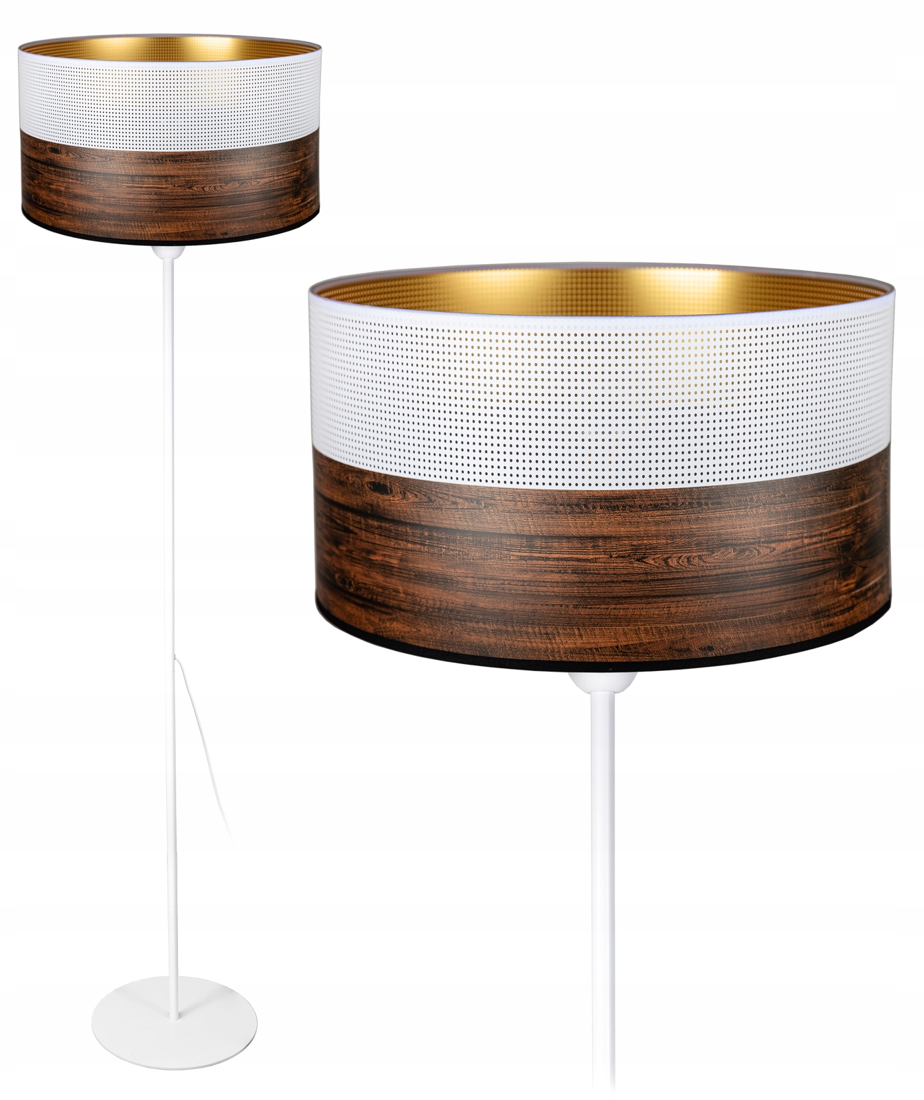 Торшер модерн - білий з абажуром білого, золотистого та імітує дерево. Дизайнерський стиль чудово впишеться у ваш інтер'єр. Він доповнює стельові світильники.