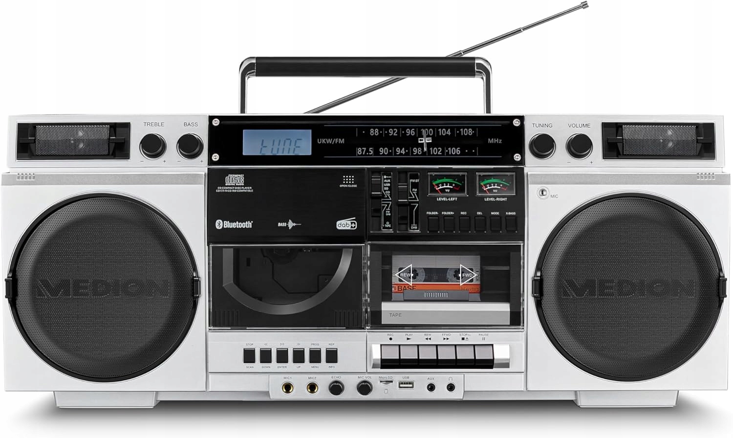 Ретро -бумбокс з 80 -х. Він пропонує широку функцію запису, яка дозволяє зберігати та розширювати свою музичну колекцію. Ви можете не лише перенести музику з радіо, CD або USB -касет або карт MicroSD, але також можете записати вміст радіо або CD для касети. Ця універсальна функція дозволяє захоплювати та насолоджуватися улюбленими звуками, незалежно від кращого мультимедіа.