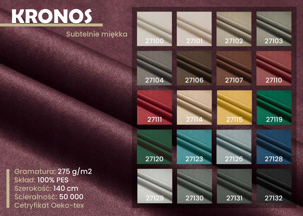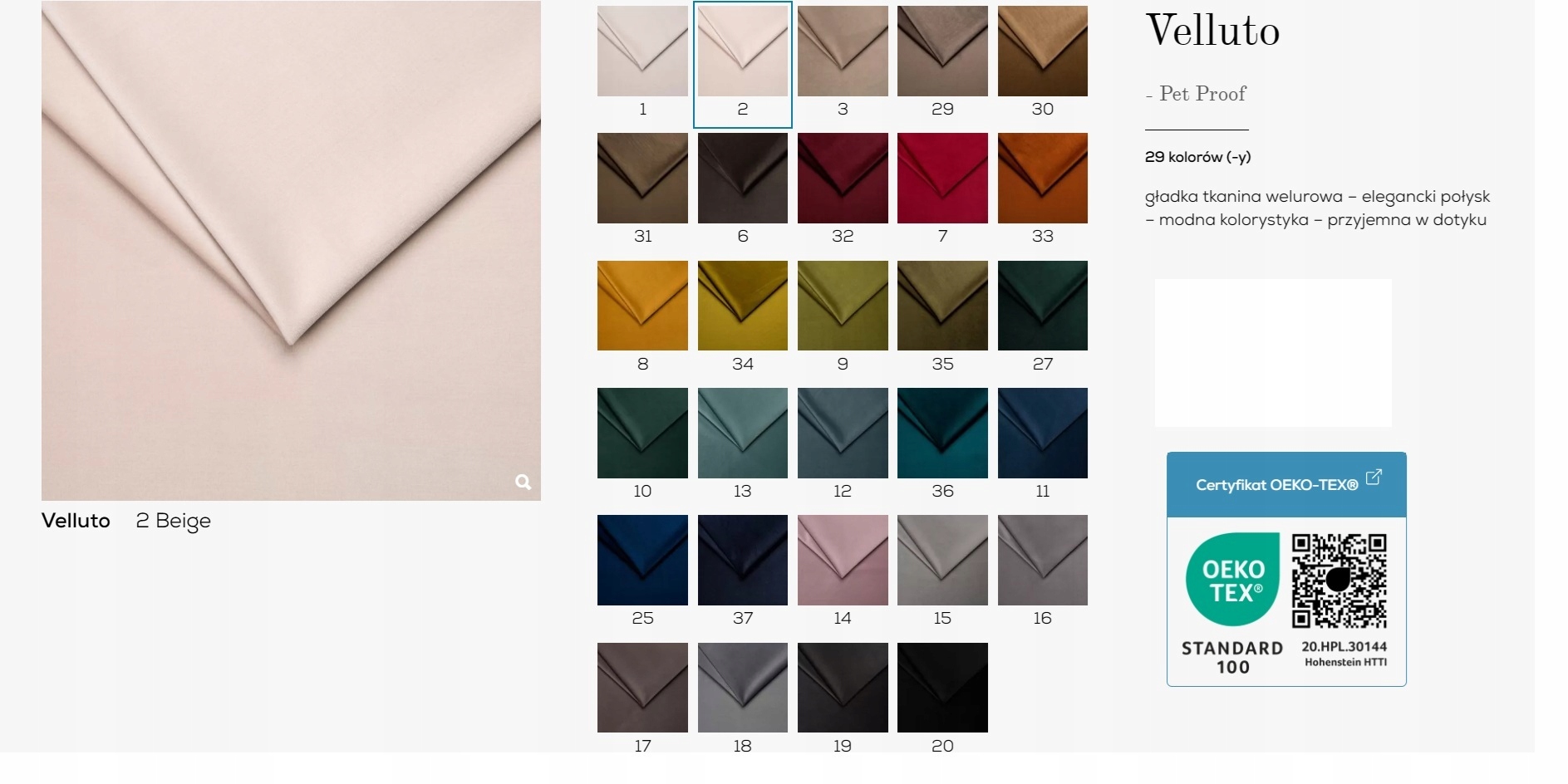 - Характеристики: легко чистити, сертифікат Oeko-Tex, нешкідливий для тварин, екологічний тест: PN-EN 1021-1-2014-12
