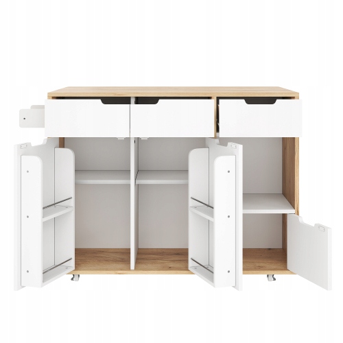 Ліва секція має дводверну шафу з полицями, середня секція має дві шухляди та велике відділення з дверцятами, а права сторона пропонує багато маленьких шухляд і відкриту полицю для швидкодоступних речей.