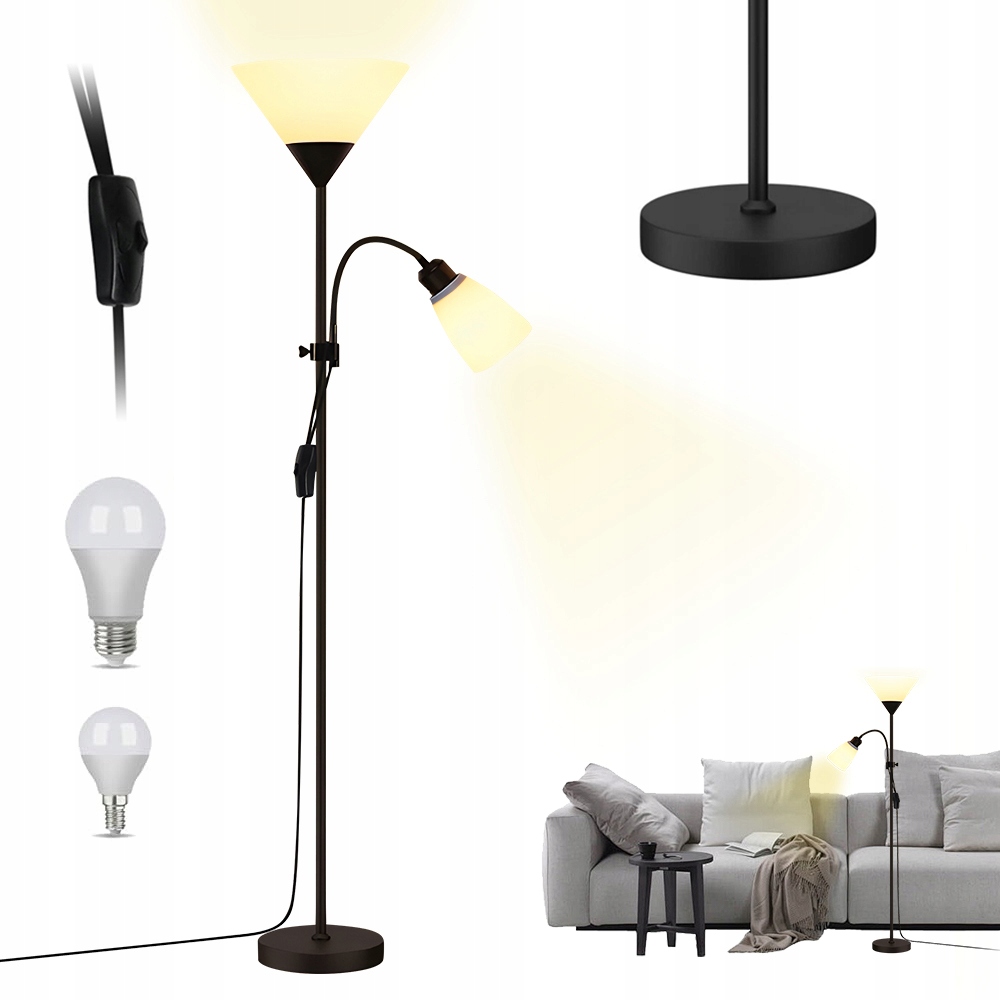 💡 Лампа для читання з ручкою, що підсвічується вгору, чорно-біла | E27, 12W, підходить до стандартних ламп | З шнуровим перемикачем