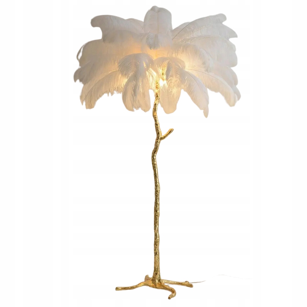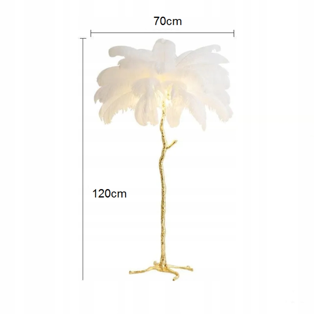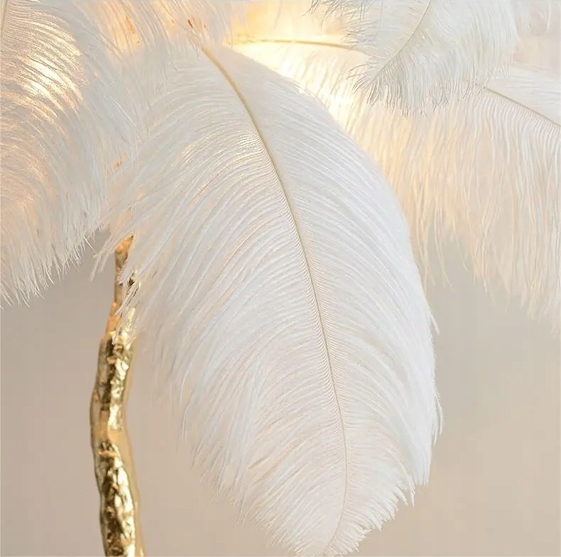 Абажур прикрашений густо розташованими пір'ям , створюючи візуальний ефект, який вражає своєю надзвичайною естетикою.